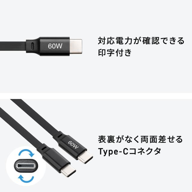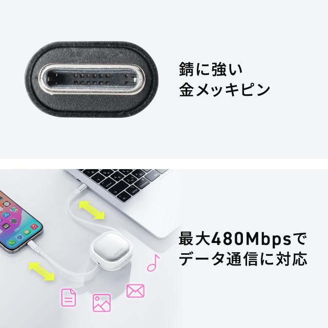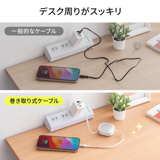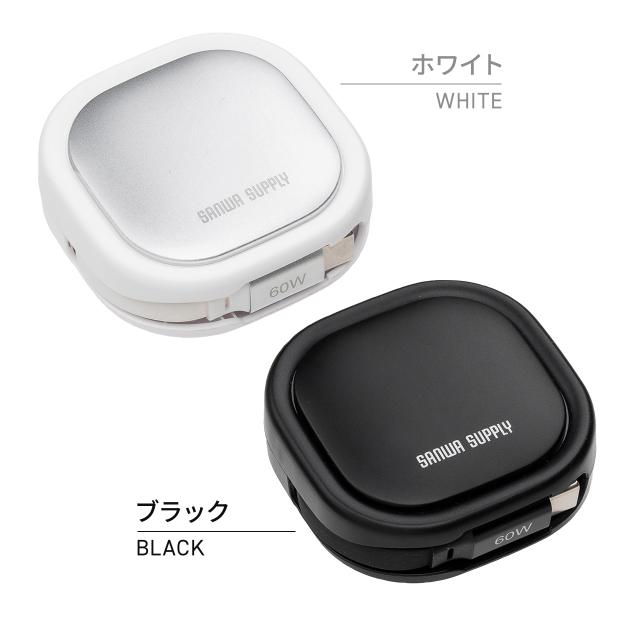 巻き取り式 USB Type-Cケーブル 両引き CtoC 1.2m PD60W 充電ケーブル データ転送 持ち運び iPad iPhone スマホ タブレット ブラック ホワイト[500-USB086]