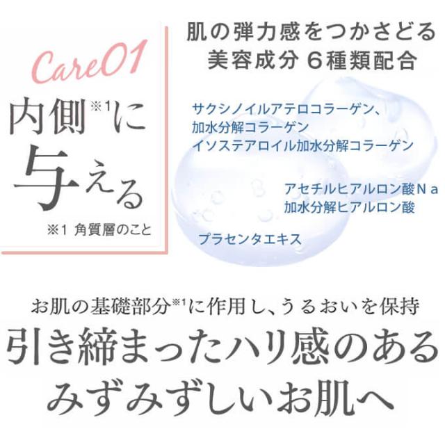 まず、ヒアルロン酸、コラーゲン、プラセンタセキスを中心としたお肌の弾力感を与える美容成分を6種類配合することで、肌の角質層に作用し、うるおいを保持。