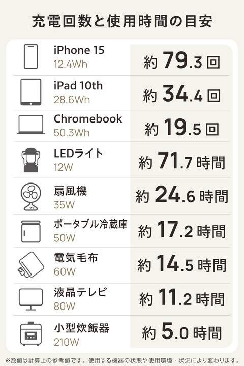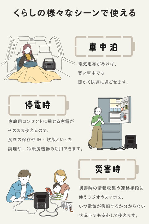 予期せぬ停電時にも心強い、大容量×ハイパワーを実現。AC・DC・USB出力対応の1228.8Wh ポータブル電源です。安全性が高く長寿命のリン酸鉄リチウムイオンセル電池を採用。災害用の予備電源として活用できます。![]() ■電源のない場所でも家電製品の使用やデバイスの充電などを可能にする、AC・DC・USB出力対応の1228.8Wh ポータブル電源です。 ■USB-A出力ポートを4口、USB Type-C(TM)出力ポートを2口、ACコンセントを4口搭載しており、スマートフォン・ノートパソコンの充電はもちろん、炊飯器や電子レンジ、液晶テレビなどの家電も幅広く使用可能な大容量モデルです。 ■もしもの際にさまざまな場面で活用できる、防災用にぴったりの大容量・高出力を実現しています。 ■急速充電技術を採用。AC入力での充電時は急速/通常の2つのモードを選択でき、急速充電モードでは最大1200Wの入力により本体を約90分でフル充電できます。 ■AC入力での通常充電モード時は、静音での充電が可能。屋内や夜間も周囲を気にせず使用できます。 ■従来のリチウムイオンセル電池より発火がしにくく、電気自動車などにも採用されている安全性の高いリン酸鉄リチウムイオンセル電池を採用しています。 ■本製品が採用するリン酸鉄リチウムイオンセル電池は、従来のリチウムイオンセル電池の約6倍の長寿命(約3000サイクル)の電池となっています。 ■ACコンセント、USB-Aポートをそれぞれ4口、USB Type-Cポートを2口、カーアクセサリーソケットを1口搭載しています。複数ポートを同時に接続しての利用が可能です。 ■ACコンセントは4ポート合計1500Wを出力できます。3ピンプラグにも対応しています。 ■USB Type-C1ポートとUSB Type-C2ポートはUSB Power Deliveryに対応しています。給電する機器がUSB Power Deliveryに対応している場合、最大100Wで給電できます。 ■USB-A1ポートとUSB-A2ポートは最大18Wで、USB-A3ポートとUSB-A4ポートは最大12Wで出力可能です。 ■カーアクセサリーソケットは最大126Wでの出力が可能です。 ■AC入力電力がAC出力電力より大きい場合には、家庭用コンセントからの電力をそのままAC出力させるバイパスモードを搭載しています。 ■本製品を家庭用コンセントと家電との間に接続しておくことで、停電時に自動的に本製品からの給電に切り替わります。常時通電したい家電を稼働し続けることができるので安心です。 ■※本製品からの給電に切り替わるのに最大10ミリ秒が必要となります。そのためUPS(無停電電源装置)としては使用できません。 ■室内で保管しておく場合、コンセントに挿したままの状態にしておくことで、満充電に近い状態(※)を維持できます。急に使う予定ができた際にも、すぐに使えて安心です。 ※95%で自動充電を開始し100%で停止 ■ボタンや接続ポートは2ヶ所にまとまっていて、操作しやすいシンプルな設計。初めて使用する際もあわてず簡単に使えます。 ■電池残量や本製品の充電にかかる時間など、必要な情報はLCDディスプレイで確認できます。使用状況がひと目で分かるため、計画的に使えて安心です。 ■LEDライト付き。暗い場所でも手元や周囲を照らすことができる他、災害時にSOSを発信できる点滅モードも搭載しています。 ■ACコンセントは正弦波で出力されます。自宅で使用している家電を同じように使える仕様です。 ■内蔵の充電式リン酸鉄リチウムイオンセル電池は、JIS C8711およびJIS C8712(JIS C8714の内容を含む)に準拠した安全設計です。 ■過充電・過放電・過電圧・過電流防止機能および短絡保護機能を備えた安心の回路設計です。 ■※工場出荷時に60%程度充電されています。充電式リチウムイオン電池は時間とともに放電するので、はじめてお使いになるときは、本製品を十分に充電してからご使用ください。 ■※充電が空の状態で長期保管すると、性能が劣化したり、充電ができなくなったりする場合があります。本製品を長期保管するときは、定期的に60%〜80%程度の充電をしてください。 ■二人で持ち運ぶ時に便利な両側ハンドル付きです。 ■本製品への入出力が可能なカーアクセサリーソケットアダプター(シガーチャージャー)を付属しています。 ■本製品は、防災必要性・安全性・機能性において一般社団法人防災安全協会の評点をクリアし、防災製品等推奨マークを取得しています。 ■※USB Type-C and USB-C are trademarks of USB Implementers Forum ![]() ■AC入力口数:AC 3PIN インレット×1 ■AC定格入力電力:本体充電モード:1200W、バイパスモード:1500W ■AC定格入力電圧:90V〜110V 50Hz/60Hz ■AC定格入力電流:本体充電モード:12A、バイパスモード:15A ■DC入力口数:DCジャック(外径7.9mm×内径0.9mm)×1 ■DC定格入力電力:ソーラーパネル入力:400W、カーアクセサリーソケット入力:192W ■DC定格入力電圧:ソーラーパネル入力:13V〜45V、カーアクセサリーソケット入力:12V/24V ※対応する当社製ソーラーパネルはMPA-SP100Dシリーズとなります。 ■DC定格入力電流:ソーラーパネル入力:10A、カーアクセサリーソケット入力:8A ■合計最大入