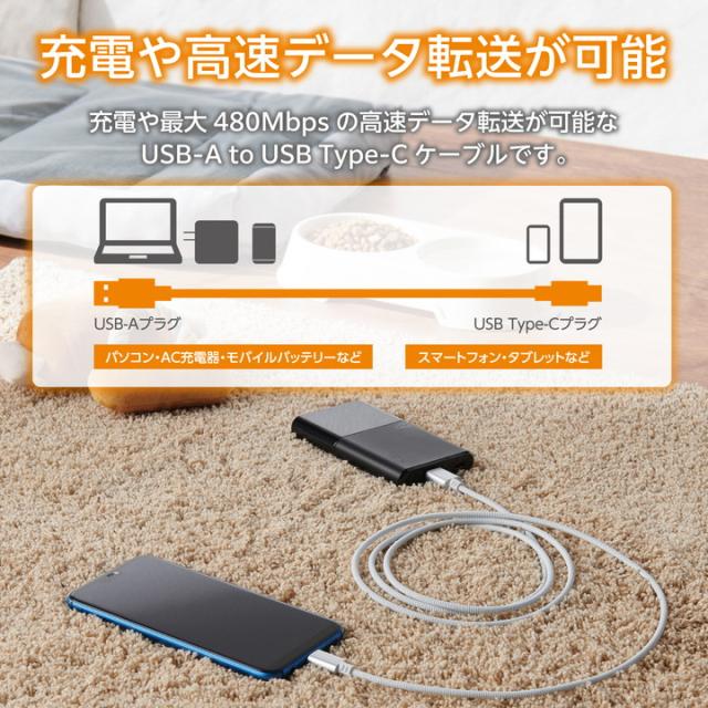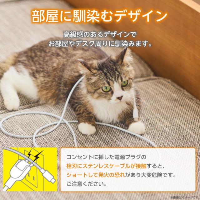 いたずら好きのワンちゃん・ネコちゃんがいるおうちに。噛んでも断線しにくい、耐久性と安全性に優れたUSB-A - USB Type-C(TM)ケーブルです。ステンレス製の外皮がケーブル内部をしっかり保護。ペットへの安全性にも配慮した設計です。