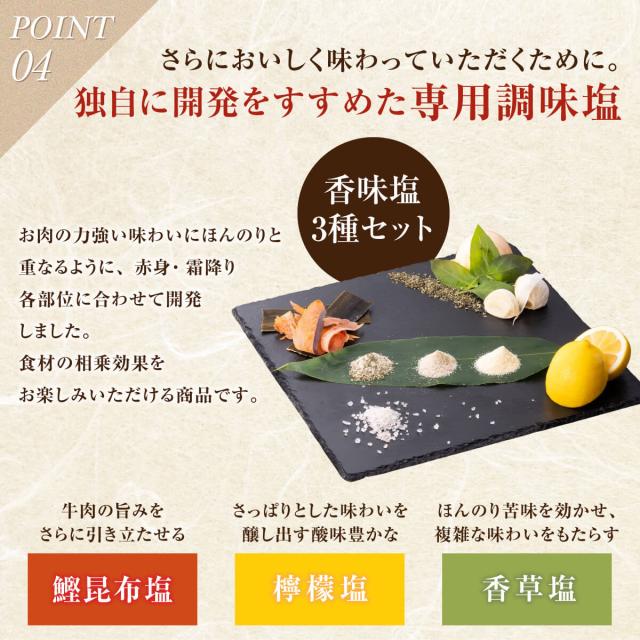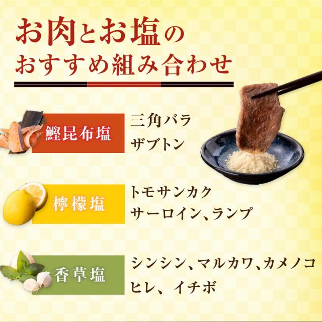 ■原材料名 | 【鰹昆布塩】焼塩(国内製造)、かつお、昆布 【檸檬塩】岩塩(パキスタン産)、レモン/トレハロース 【香草塩】岩塩(パキスタン産)、焼塩(国内製造)、玉葱、バジル、ニンニク粉末(ニンニク、でん粉、食塩)、タイム/調味料(アミノ酸)、増粘剤(グァーガム)