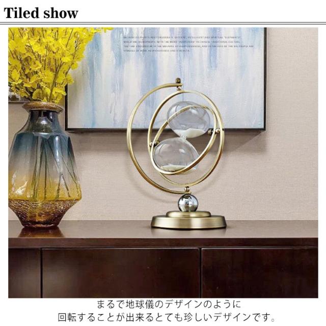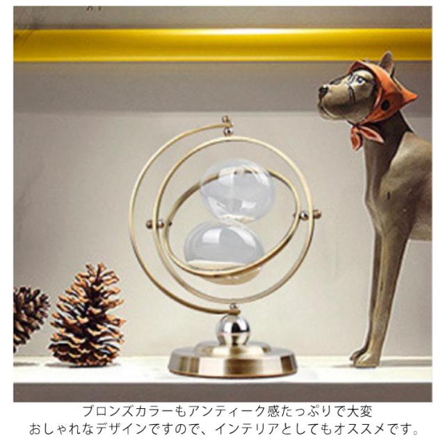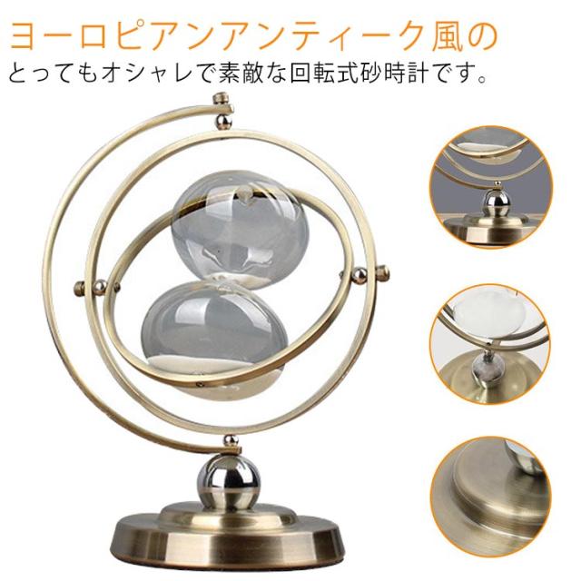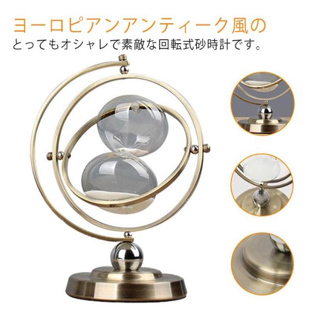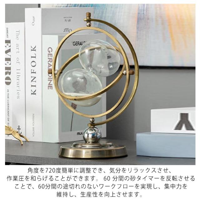 | ヨーロピアンアンティーク風のとってもオシャレで素敵な回転式砂時計です。 まるで地球儀のデザインのように回転することが出来るとても珍しいデザインです。 角度を720度簡単に調整でき、気分をリラックスさせ、作業圧を和らげることができます。 60 分間の砂タイマーを反転させることで、60分間の途切れのないワークフローを実現し、集中力を維持し、生産性を向上させます。 ブロンズカラーもアンティーク感たっぷりで大変おしゃれなデザインですので、インテリアとしてもオススメです。 デジタルな世の中ですが、アナログなアイテムでゆったり時間を計るのもステキですね。 | |
