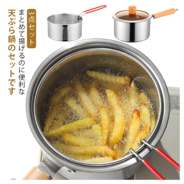 | まとめて揚げるのに便利な天ぷら鍋のセットです。【3点セット】 セット内容:お鍋、ガラス蓋、こし器。 油切りに便利なこし器付きです。 ガス火はもちろん、IHにもお使いいただけます。 木製ハンドル&丈夫で耐食性に優れたステンレス製。 | |