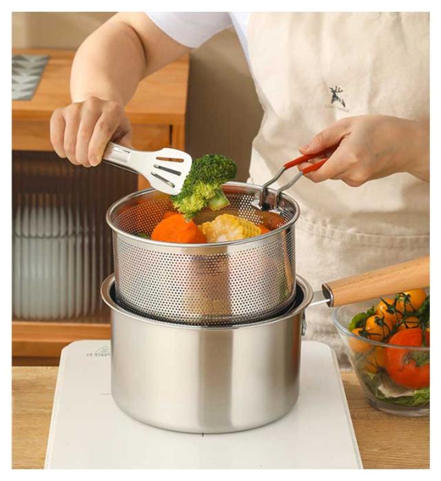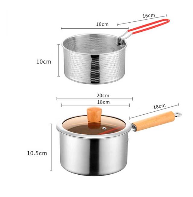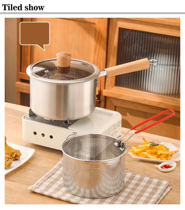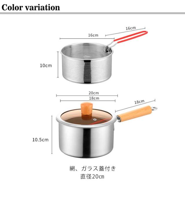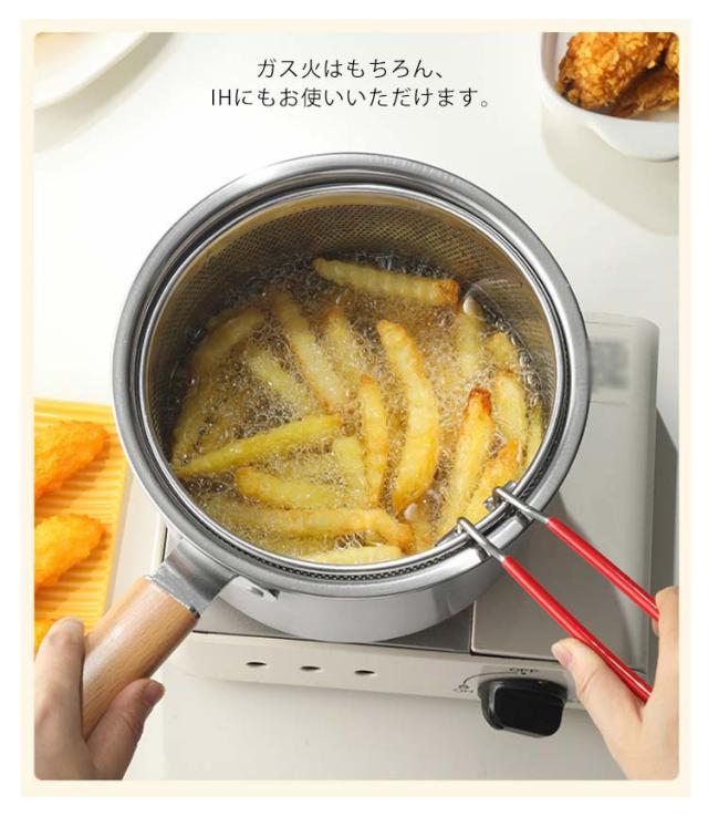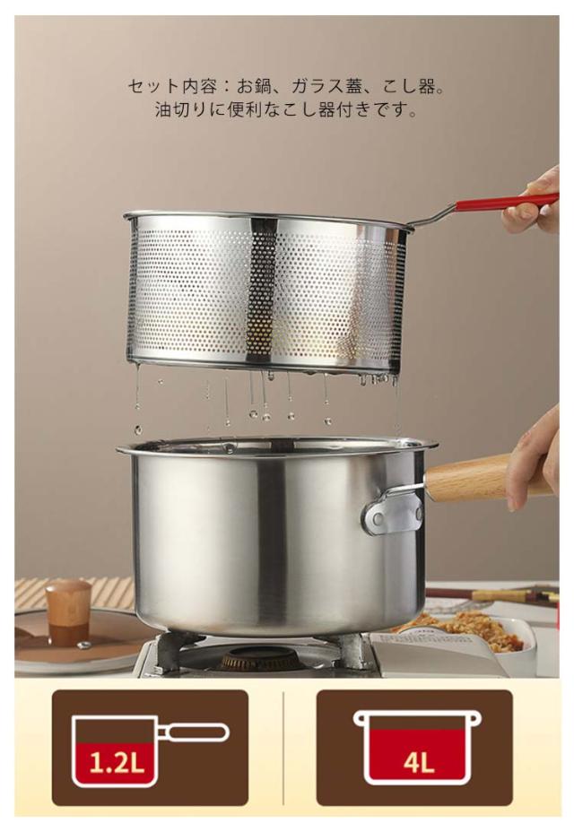 天ぷら鍋 揚げ鍋 ガラス蓋付き こし器付き ih対応 揚げ物鍋 ステンレス 片手鍋 深型 木製ハンドル 網付き ザル付き IH ガス火対応 少ない油 天ぷら 揚げ物 鍋 調理器具 炒め鍋 煮る鍋 フライパン おしゃれ 一人暮らし 小鍋 小さめ 小さい 天ぷら用鍋 直径20cm 【送料無料】