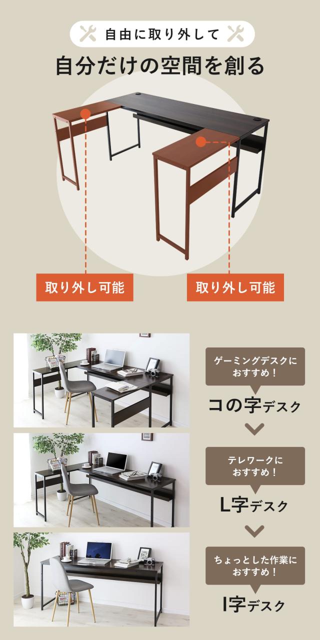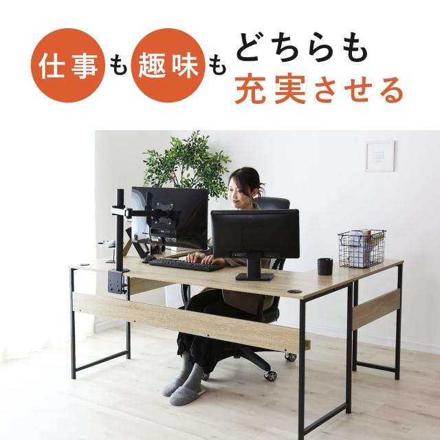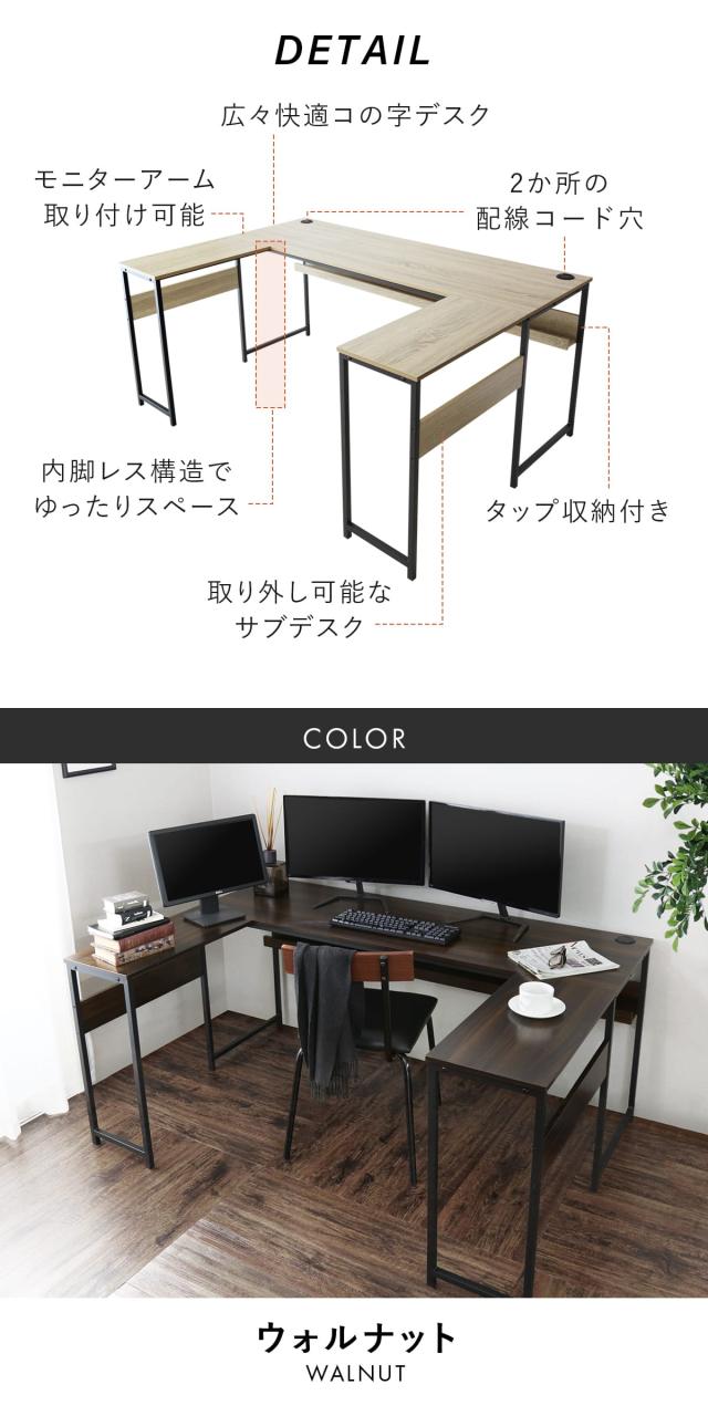 広々としたコの字デザインで、作業効率を高めながらも、どんな空間にも美しく馴染む設計が魅力の多機能デスクです。オフィスやリモートワークスペース、ゲーミング環境まで、さまざまなニーズに対応できるこのデスクは、コード穴2つやタップ収納など、充実した機能で作業環境を快適にサポートします。内脚レス構造により、足元を広く保てるため、ストレスフリーで快適な作業が可能。取り外し可能なサブデスクがセットになっており、レイアウトを自由に変えられるので、スペースを最大限に活用できます。