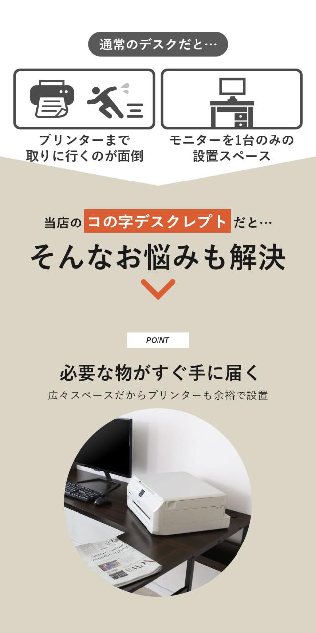 デスク「レプト」は、作業スペースを広々と使えるコの字型デザインを採用しています。幅160cm、奥行110cmという広い設計により、作業に必要なパソコンや書類をたっぷりと広げて配置でき、デュアルモニターなどの複数の機器を使用する方にも最適です。さらに、コーナーをうまく利用できる形状なので、ワンルームやコンパクトなオフィスにもすっきりと収まり、作業効率をアップします。L字デスクとしても使えるため、限られたスペースを有効に活用でき、作業を快適にサポートします。