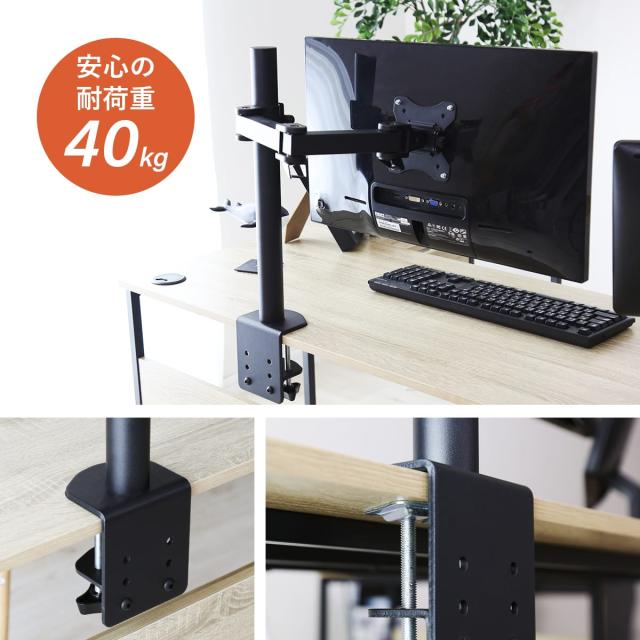 「レプト」には、モニターアームを簡単に取り付けられるスペースが確保されています。モニターの位置を自由に調整できるので、長時間のデスクワークやゲームプレイ時も、目線や姿勢を快適に保つことができ、肩や首への負担を軽減します。モニターアームを取り付けることで、机上のスペースをさらに広く使えるため、作業効率が格段にアップ。PCデスクやゲーミングデスクとしても最適な環境を提供します。