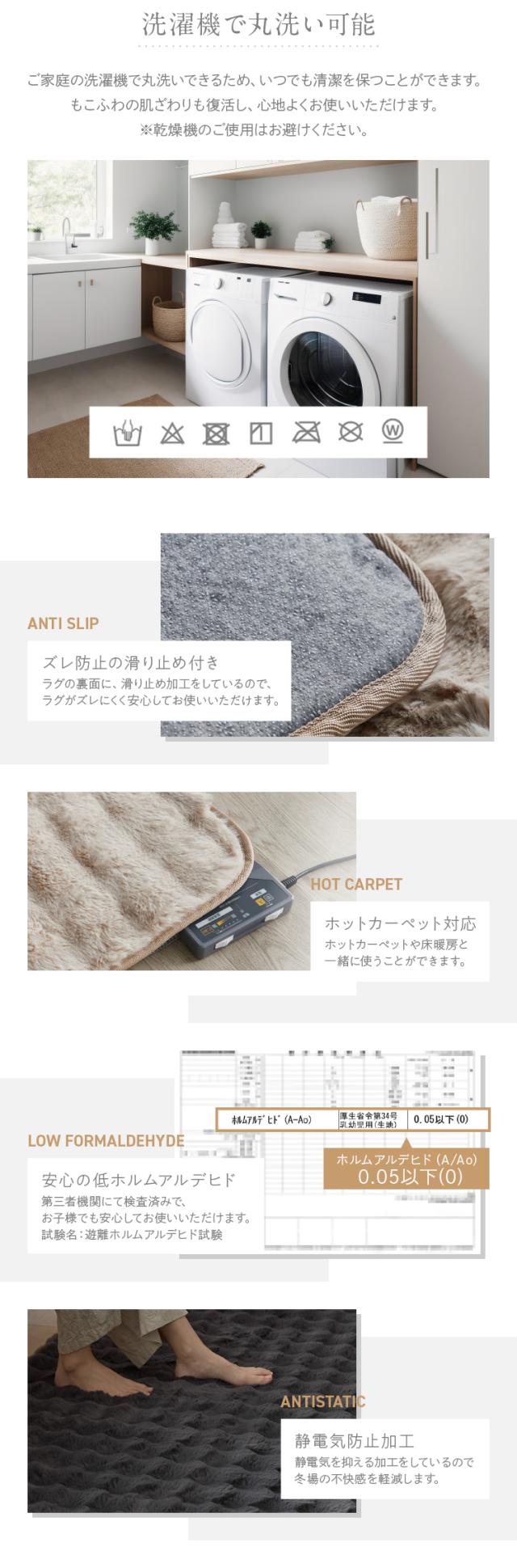 安心の低ホルムアルデヒド、静電気防止加工、裏面にズレ防止の滑り止め加工つき。