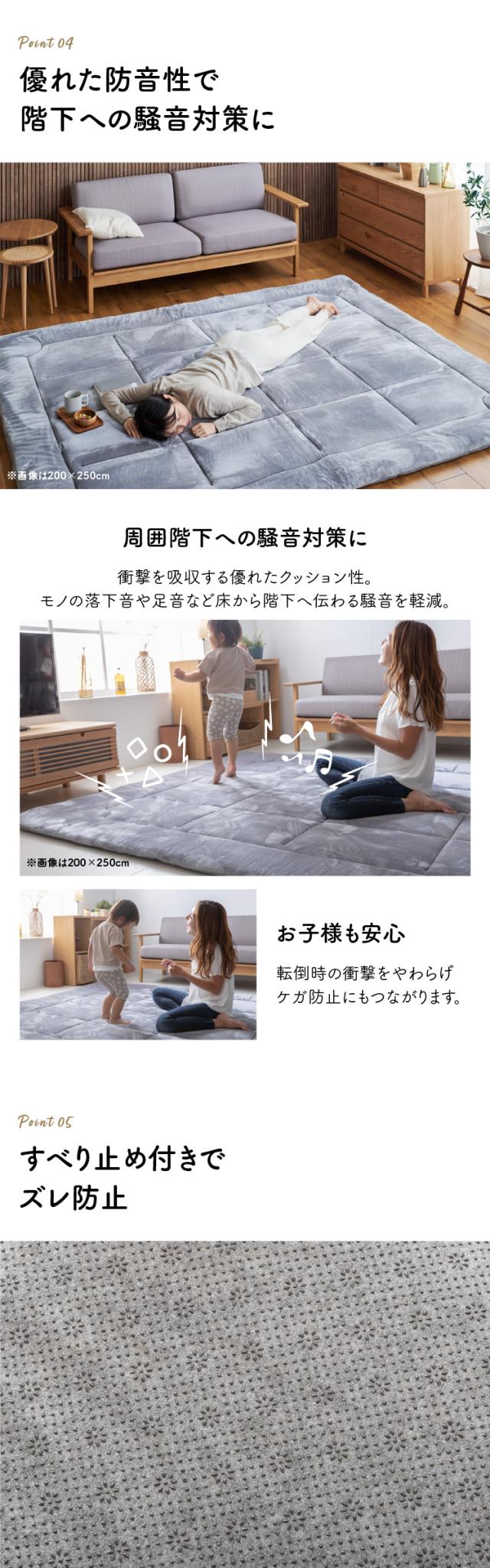 裏面にズレ防止の滑り止め加工つき、ホットカーペットや床暖房と一緒に使えます。
