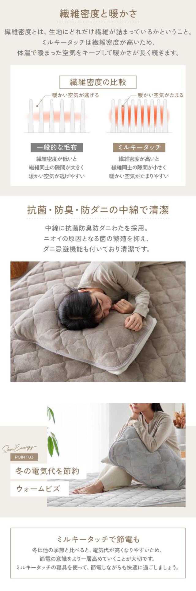 安心の低ホルムアルデヒド、静電気防止加工、中綿に菌の繁殖を抑える抗菌防臭防ダニわたを使用しています。