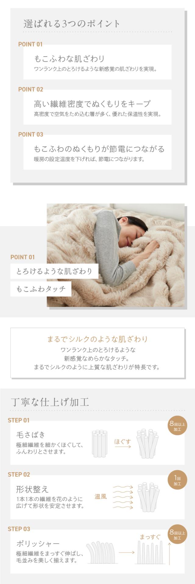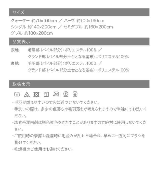 もこもこした立体カットでとろけるような肌ざわりが特長のラビットファー面と、短い毛足で上品な光沢感となめらさが特長のフランネル面の2つの素材を楽しめます。