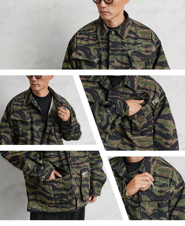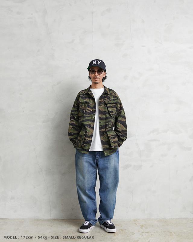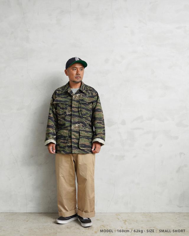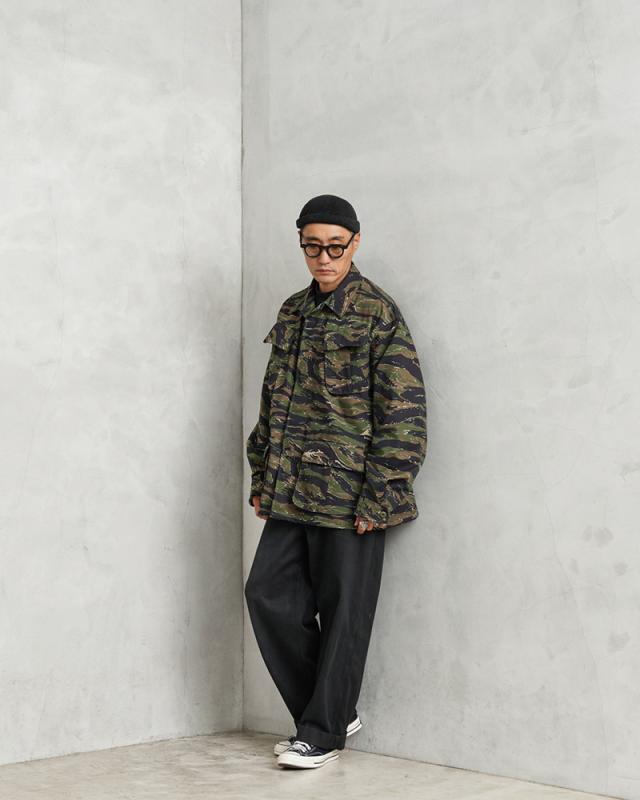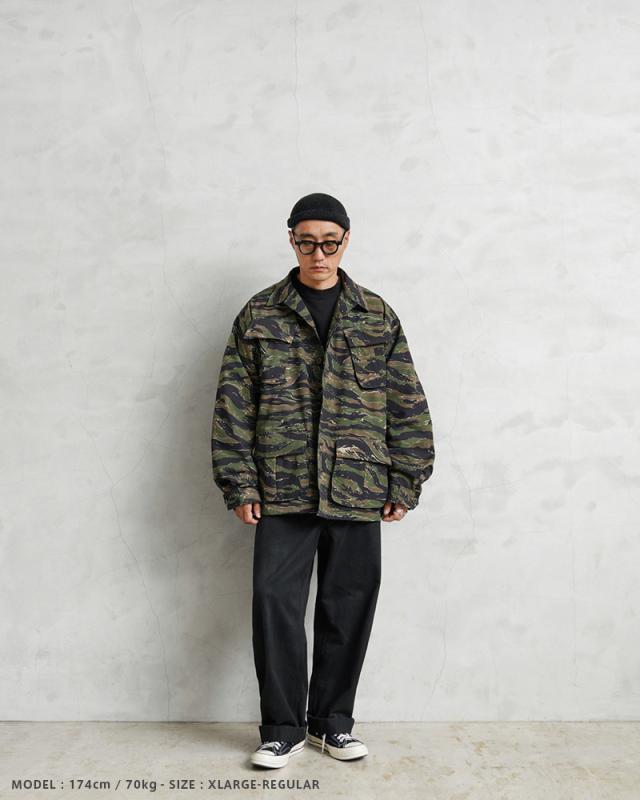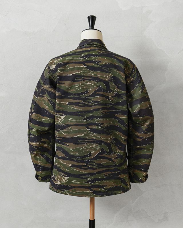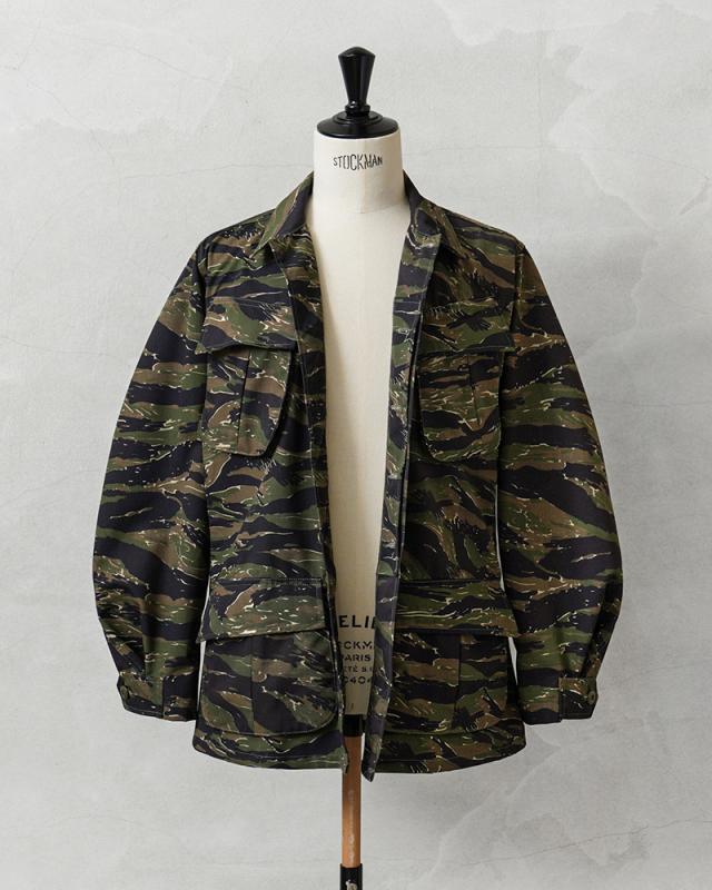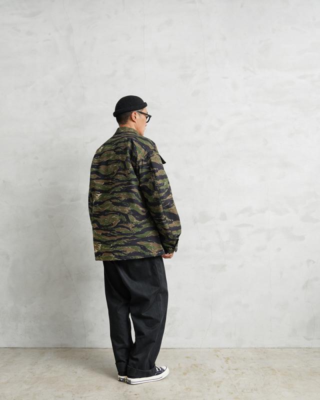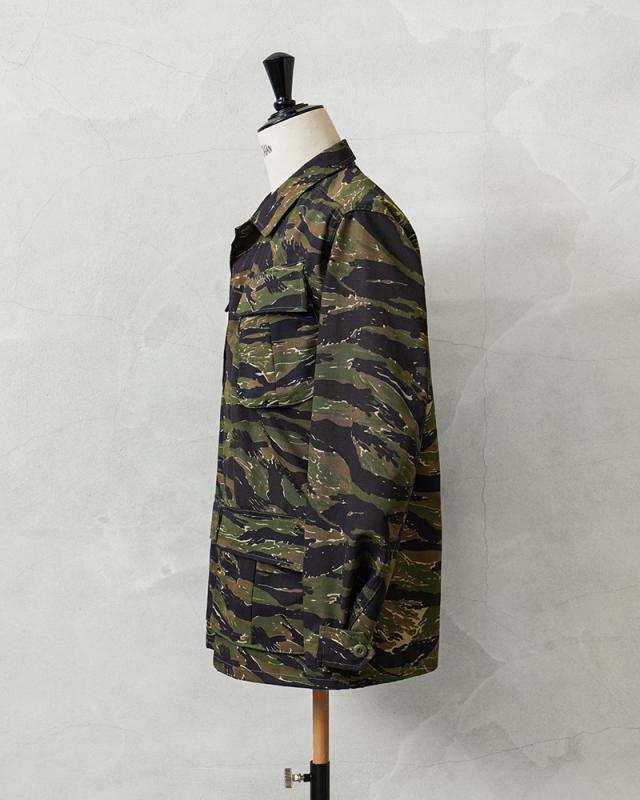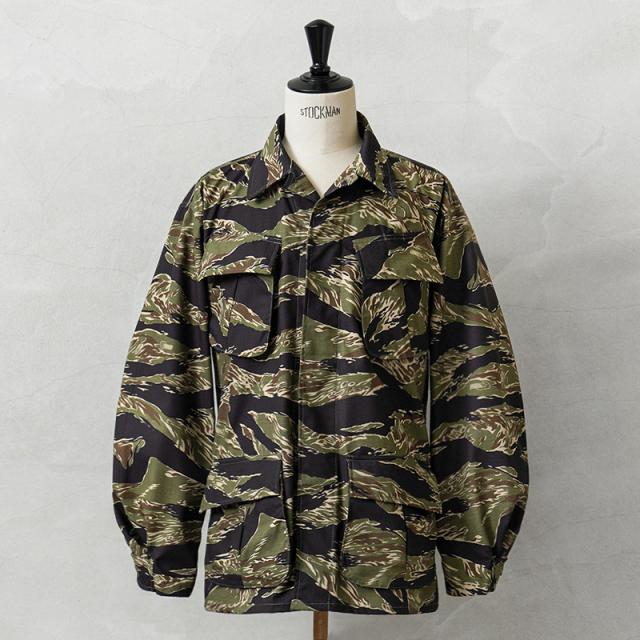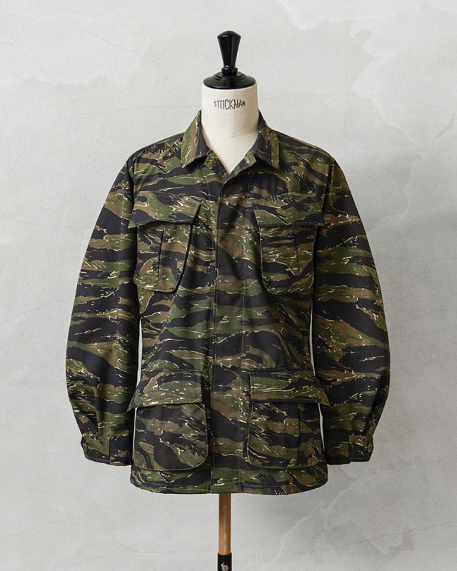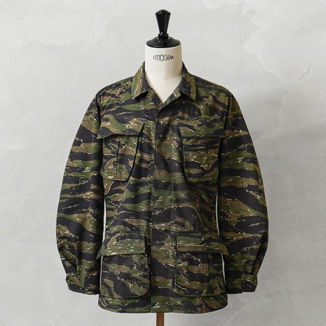 MCGUIRE ARMY NAVY社がCIVILIAN MODEL(民間モデル)として2000年代頃に製造したアイテムで、タイガーストライプを使用したジャングルファティーグジャケットで、2000年代にはアフガニスタンとイラクの両方に展開する特殊作戦部隊や、軍事演習において敵軍として編成される部隊のOPPOSING FORCE(OPFOR)などでも実際にタイガーストライプの民間モデルが採用されていました。ジャングル内で肌を覆い守るだけではなく、耐久性を保ちながら軽量化を追求された機能的なU.S.ARMYの名品です。CIVILIAN MODEL(民間モデル)といえどもアメリカ製の貴重なデッドストックアイテムです!