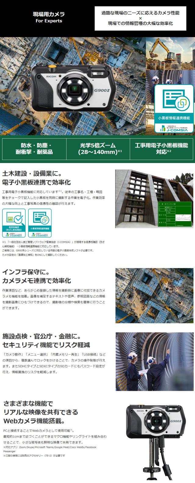 有効約2000万画素、光学5倍ズーム、建築や土木などのハードな現場に欠かせない防水、防塵、耐衝撃性能。RICOH G900 IIは、その基本性能に加え、工事用電子小黒板、強固なセキュリティ機能など、プロフェッショナルで多彩なニーズにお応えします。