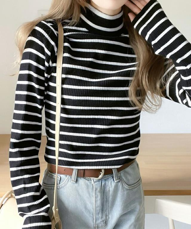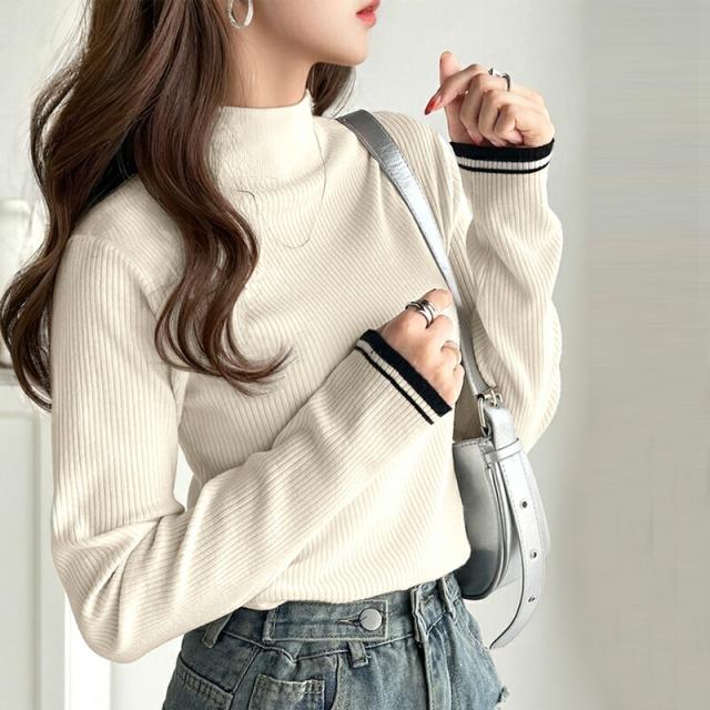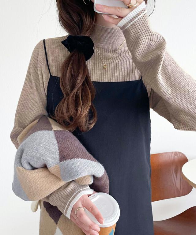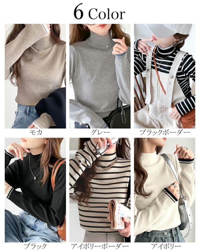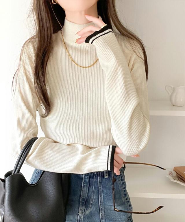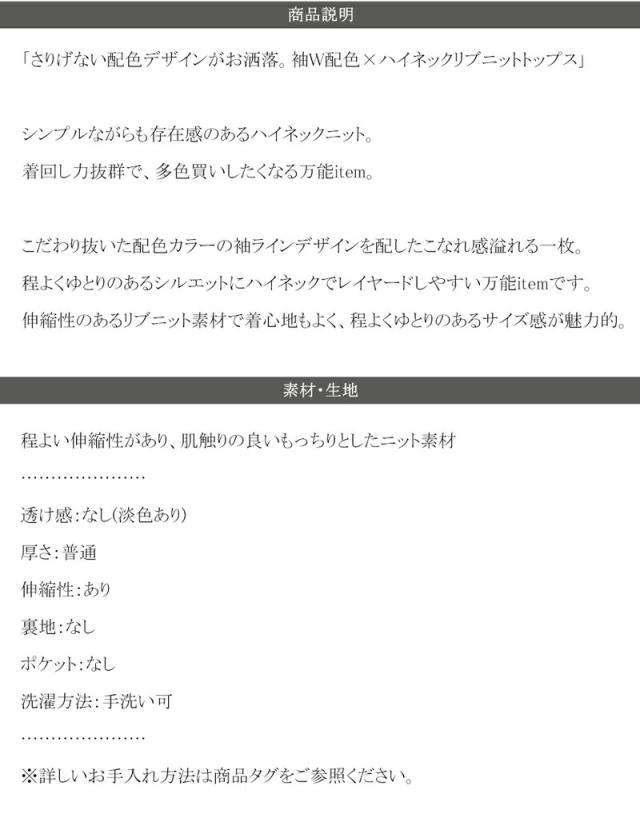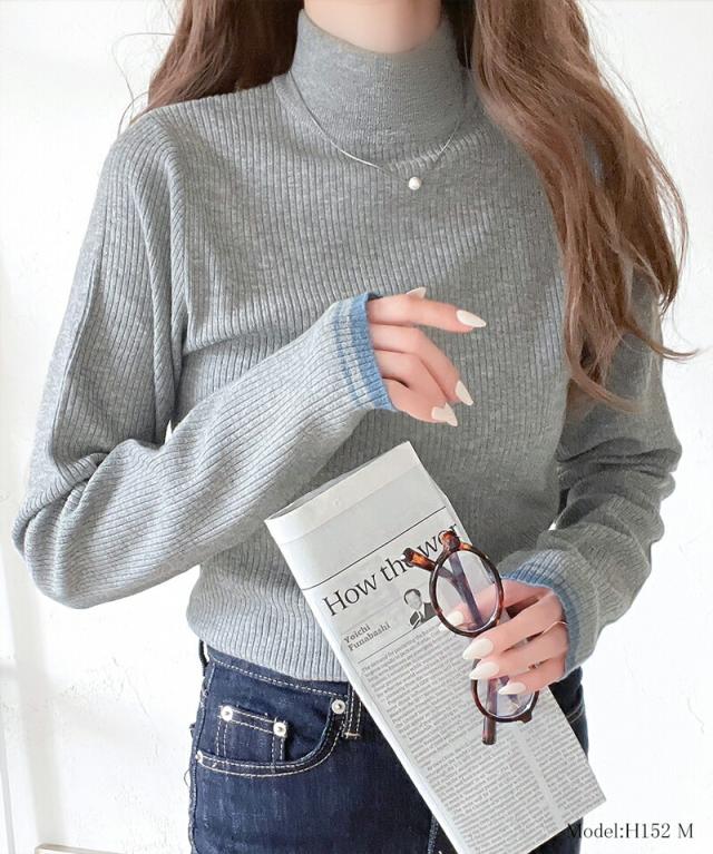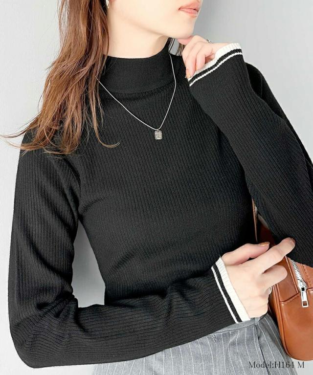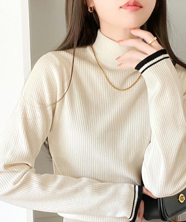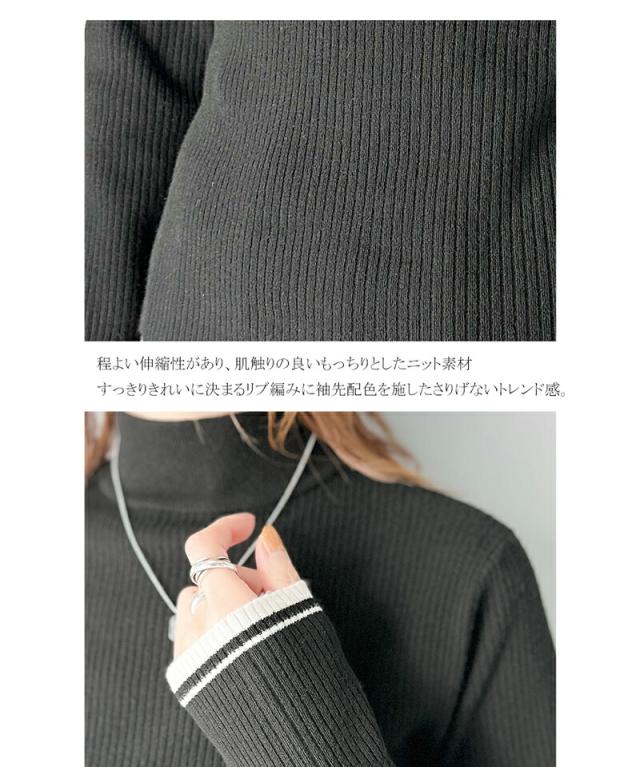 ★さりげない配色デザインがお洒落。袖W配色×ハイネックリブニットトップス★