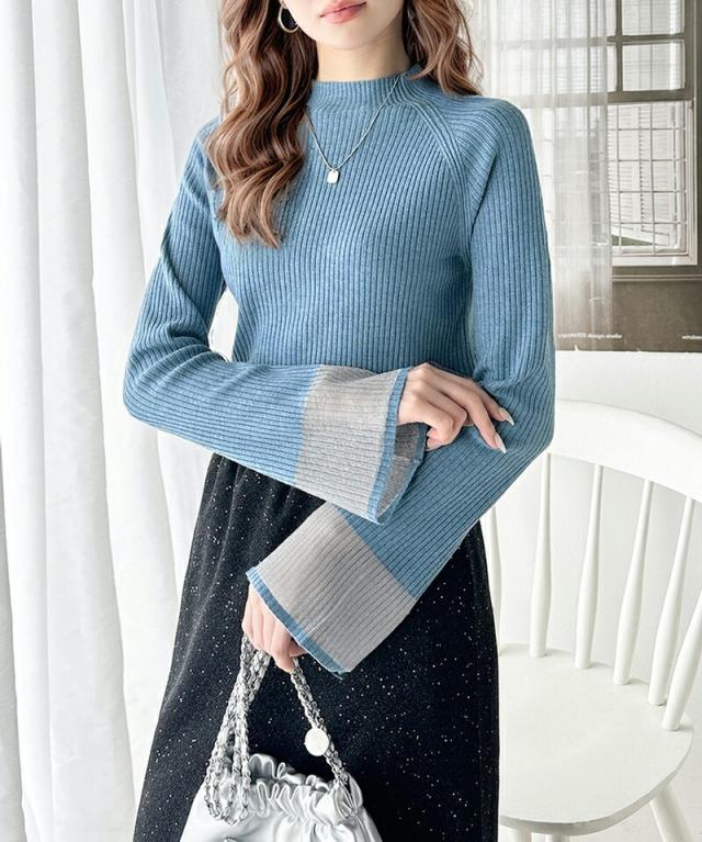 クラシカルエルフ冬新作 トップス ニット レディース 袖ロ シャイニー シアー 素材 リブニッ ト プルオーバー ラグランスリーブ フレア スリーブ ロングシーズン 着回し 大きいサイズ 2024ss ce1020154