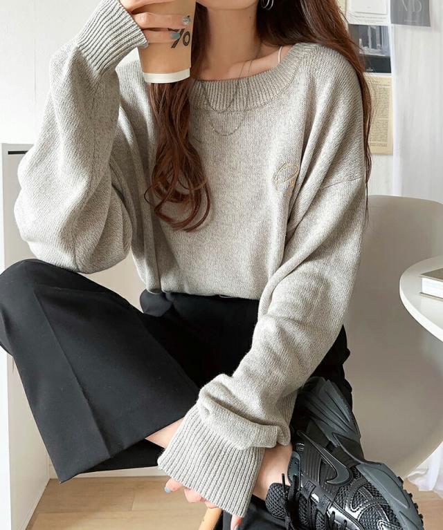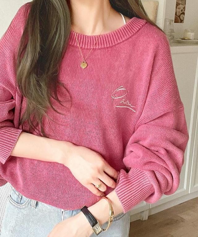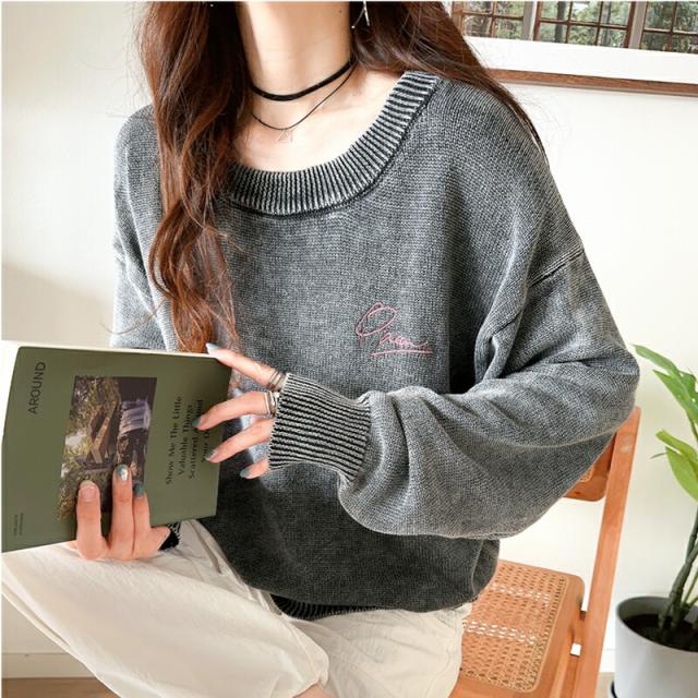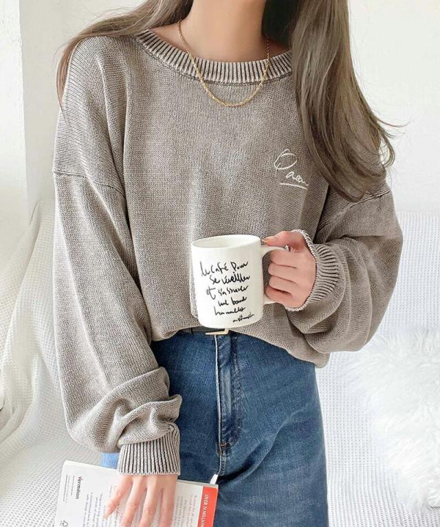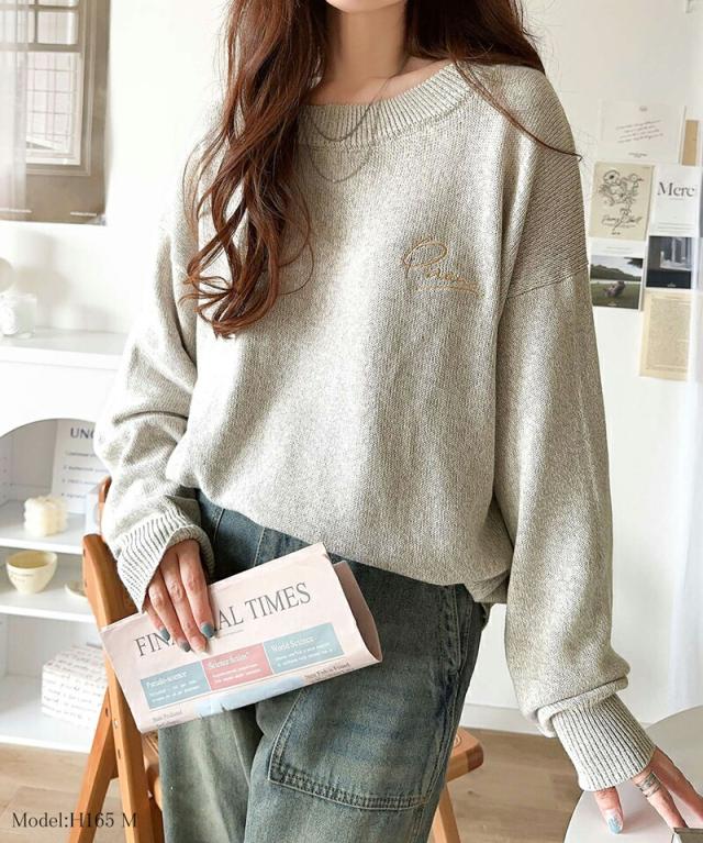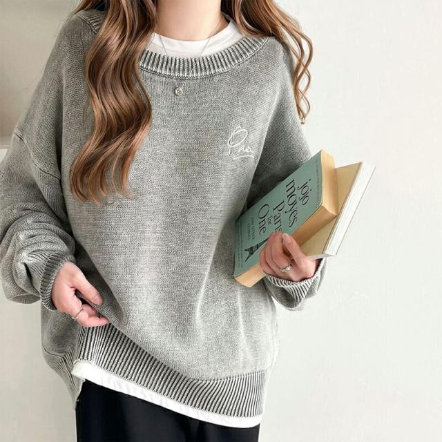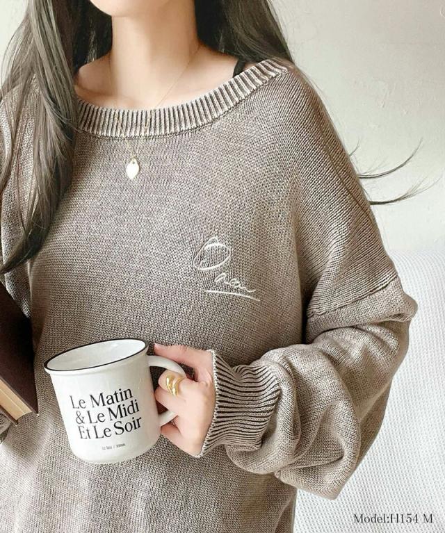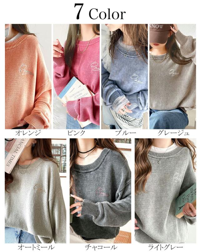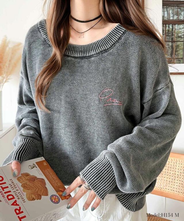 ★大人可愛いレトロな雰囲気。綿100%ワンポイント刺繍ピグメントニットプルオーバー★
