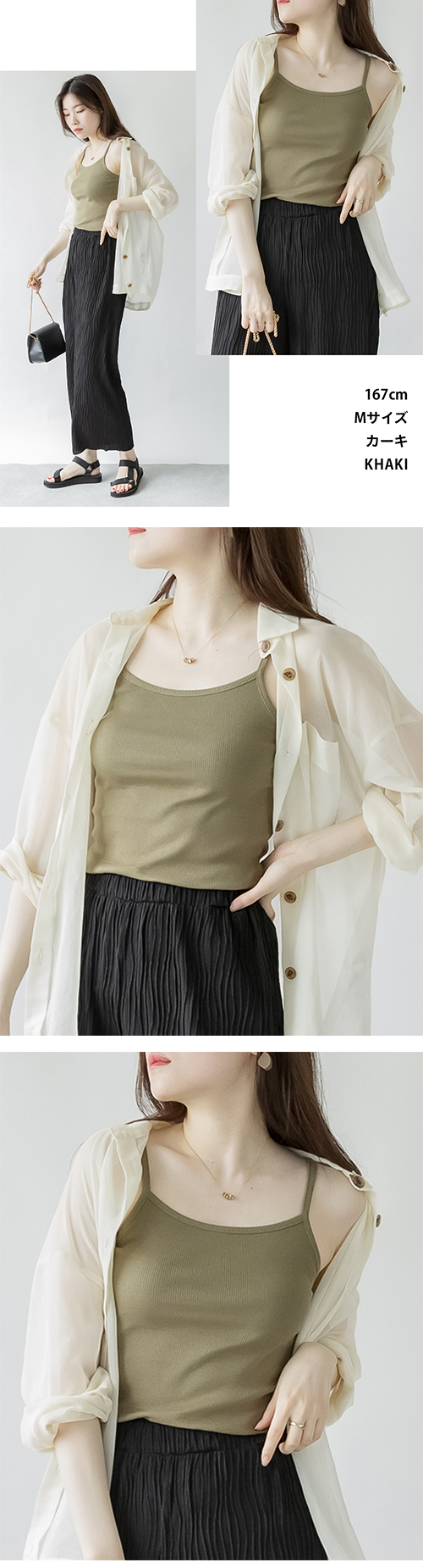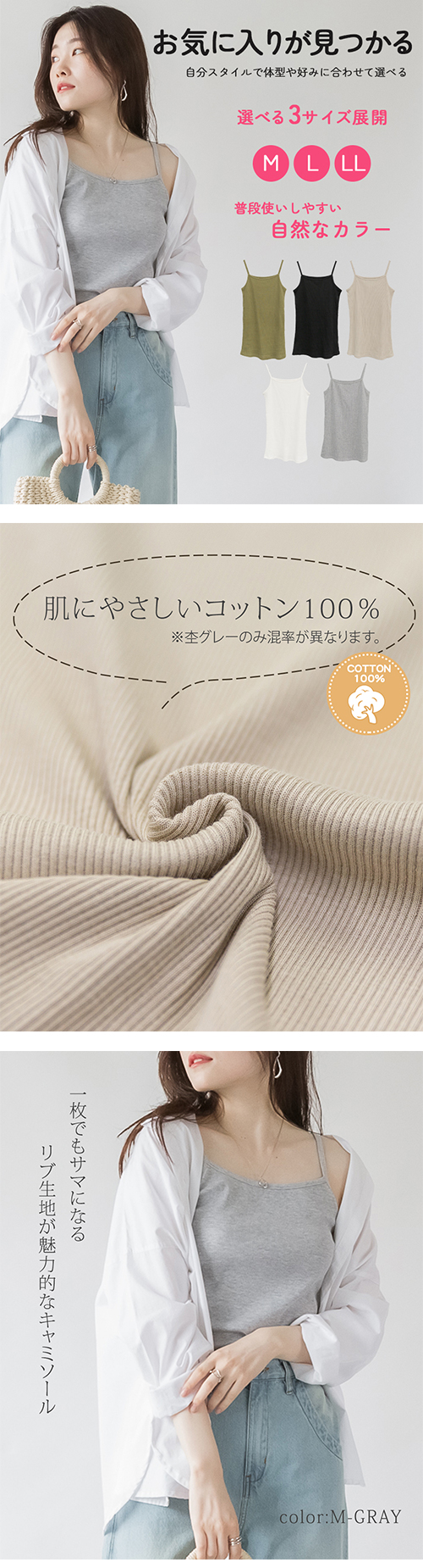 | レイヤードスタイルにぴったりのコットンリブキャミソールが登場! 肌にやさしいコットン素材を使用し、リブ編みのデザインで体にフィットしつつも動きやすさを追求しています。 シンプルで普段使いしやすい自然なカラー展開で、M、L、LLの3サイズからお選びいただけます。 単品で着用するのはもちろん、シャツやジャケットのインナーとしても活躍。お手持ちのアイテムと組み合わせて、スタイリッシュでカジュアルなコーデをお楽しみください。 |