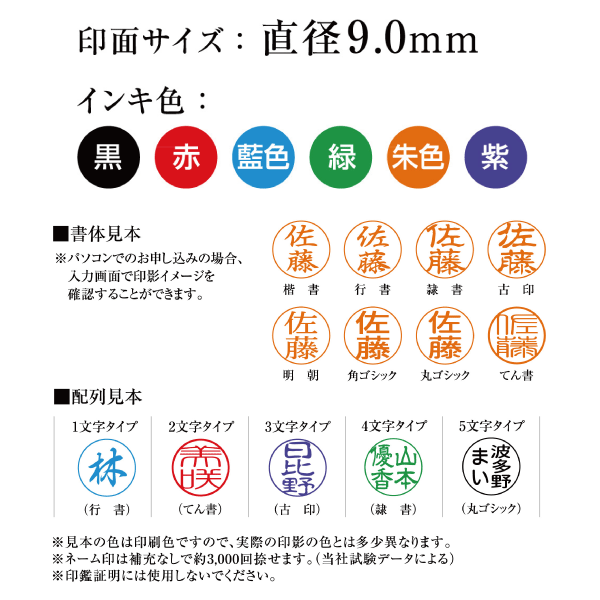 ・[ボール径]0.7mm [印面サイズ]直径9mm [書体]8書体 [インキ色]6色