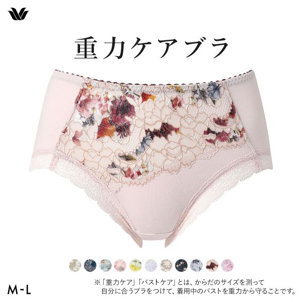 つけるだけで、重力によるバストの皮膚伸びを抑え、気軽にバストケアができる【重力に負けないバストケアブラ】ノンワイヤータイプのコーディネートショーツです。