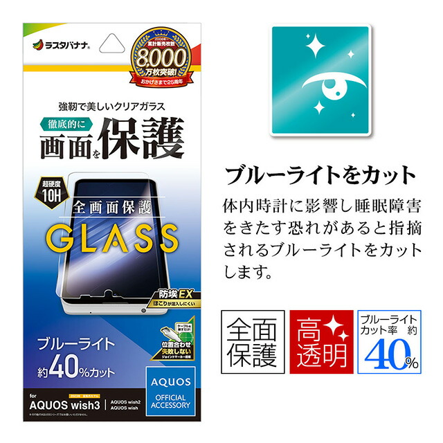 ラスタバナナ AQUOS wish3/wish2/wish ガラスフィルム ブルーライトカット 高光沢 0.33mm 位置合わせJM付き 防埃 GE3863AQOW3