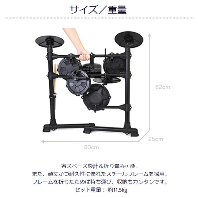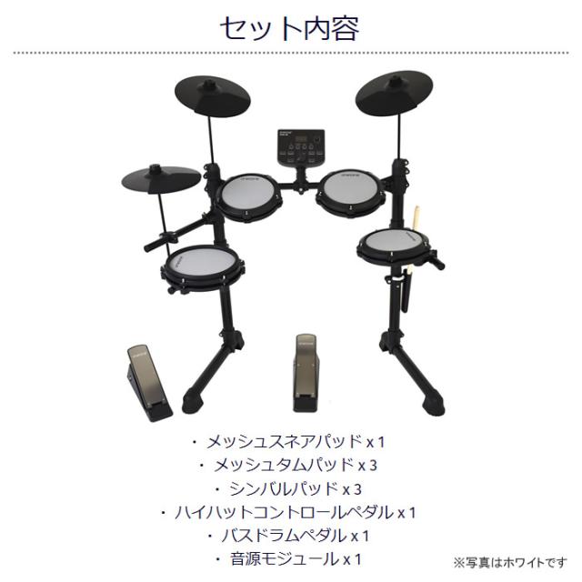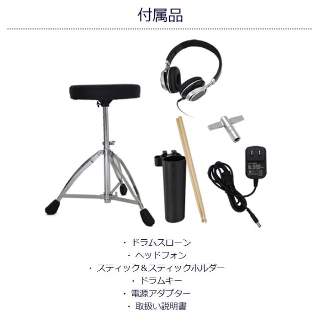 ONETONE(ワントーン)からデジタルドラムが新登場! ドラムデビューにふさわしい要素を全て盛り込んだ、 究極のハイコストパフォーマンスモデルです。 ■セット内容 ・メッシュスネアパッド x 1 ・メッシュタムパッド x 3 ・シンバルパッド x 3 ・ハイハットコントロールペダル x 1 ・バスドラムペダル x 1 ・音源モジュール x 1 ■付属品 ・ドラムスローン ・ヘッドフォン ・スティック&スティックホルダー ・ドラムキー ・電源アダプター ・取扱い説明書 ■サイズ/重量 省スペース設計&折り畳み可能。 また、頑丈かつ耐久性に優れたスチールフレームを採用。 フレームを折りたためば持ち運び、収納もカンタンです。 セット重量: 約11.5kg ■主な機能 ・キット数: 15 ・ボイス数: 165 ・メトロノーム: 30〜250 ・クリック: 1〜9 ・デモソング: 12 ・トレーニング: 3種類 ※記載は商品仕様の一部です。仕様説明不足等の理由での返品はできません。特に適合等は必ずご確認ください。