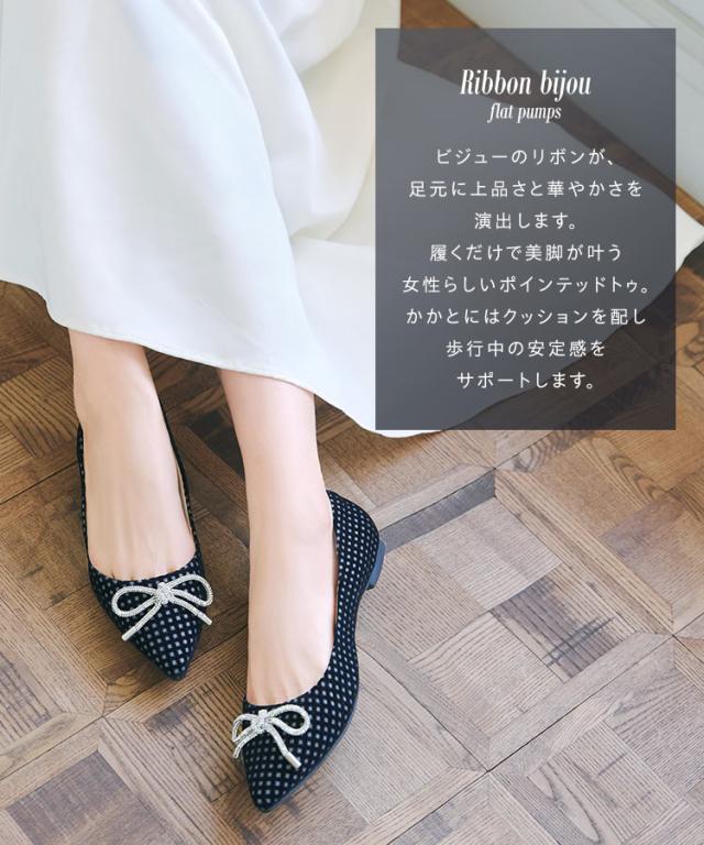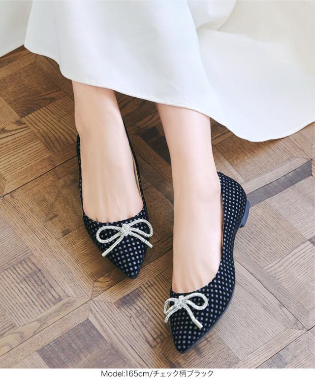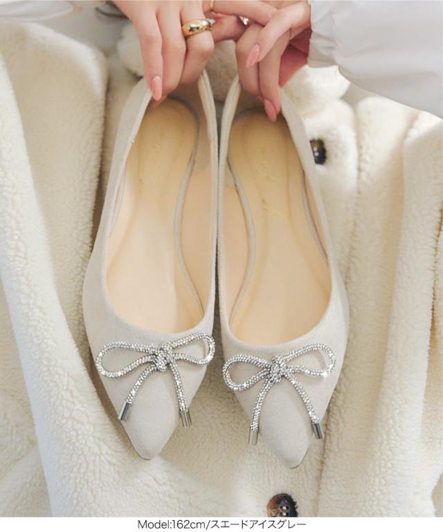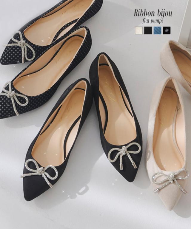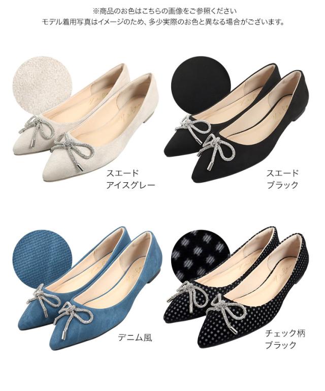 送料無料 リボンビジューフラットパンプス I2634 入荷済 レディース ポインテッド ポインテッドパンプス スエード デニム チェック チェック柄 白 アイボリー グレー ブラック 青 ローヒール ぺたんこ 歩きやすい きらきら