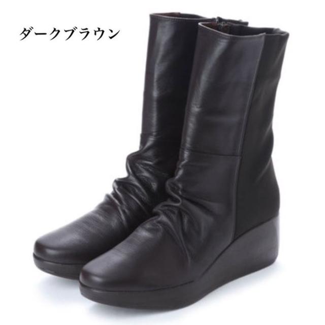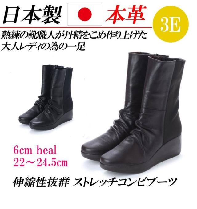 日本製 本革 ミドルブーツ ロングブーツ 厚底 幅広 3e レディースブーツ ミドル ロング ウェッジヒール ストレッチ ふかふか ブラック