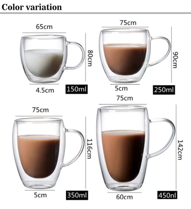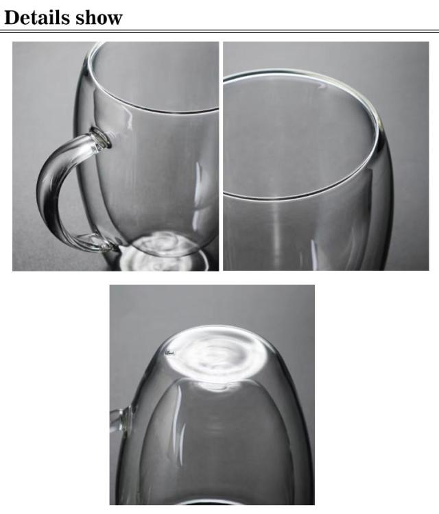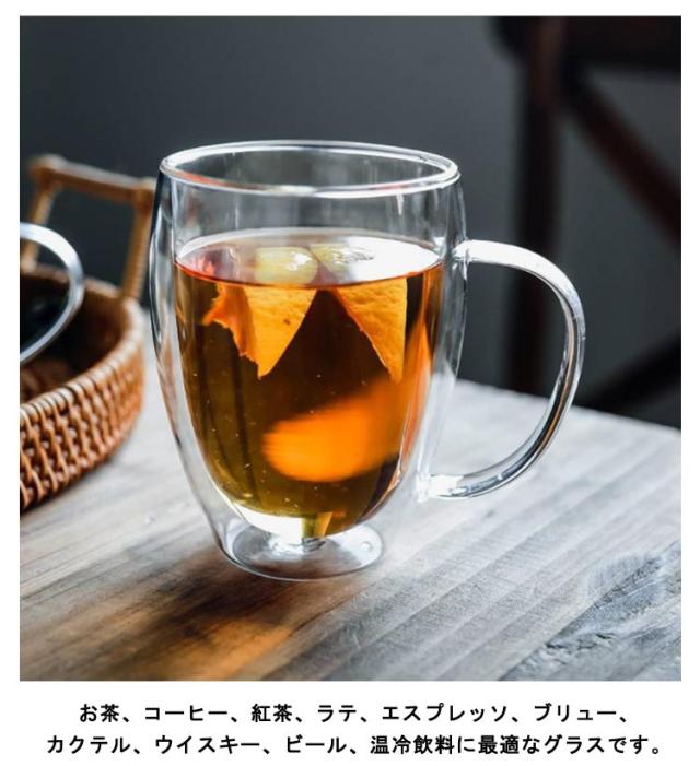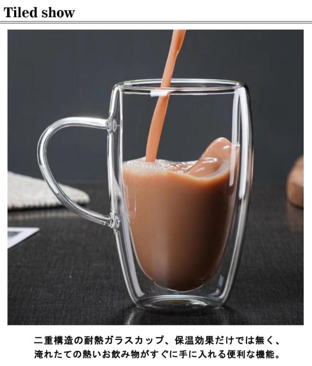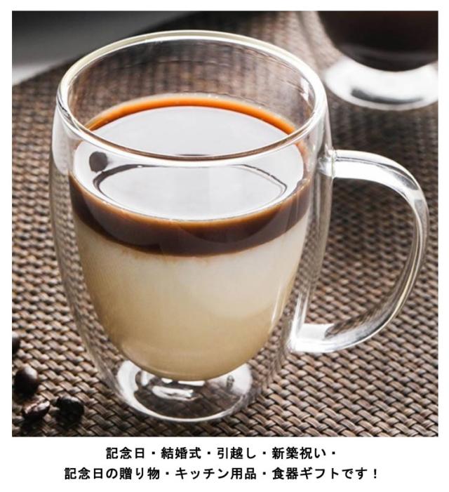 | 二重構造の耐熱ガラスカップ、保温効果だけでは無く、淹れたての熱いお飲み物がすぐに手に入れる便利な機能。 保冷効果と結露防止の効果あり、氷が溶けにくい、テーブルやコップの外はいつもきれい。飲みもののおいしさを持続させる、保温性、保冷性に優れたグラスです。 お茶、コーヒー、紅茶、ラテ、エスプレッソ、ブリュー、カクテル、ウイスキー、ビール、温冷飲料に最適なグラスです。 持ち手があり、持ってきても便利で、マグカップとして使用できます。コーヒーや茶などの飲み物を入れるカップとしてだけでなく、ビールグラスとしても使えます。 ゼリーカップ、お菓子カップにも使用することができます。カフェ、レストラン、オフィス、自宅で使ってもいいし、プレゼントとしてもいいです。 記念日・結婚式・引越し・新築祝い・記念日の贈り物・キッチン用品・食器ギフトです! | |