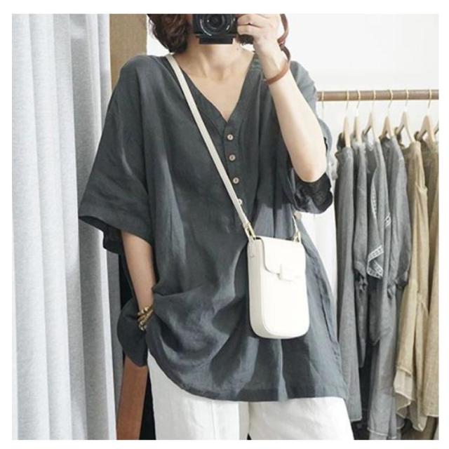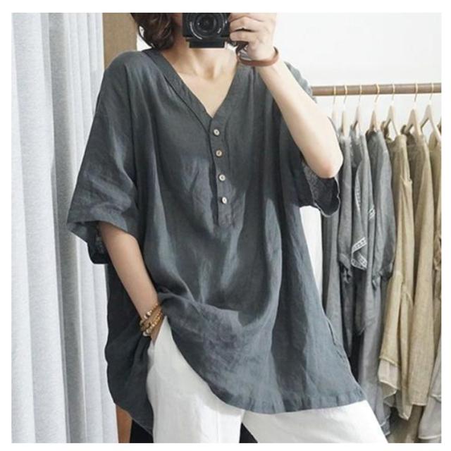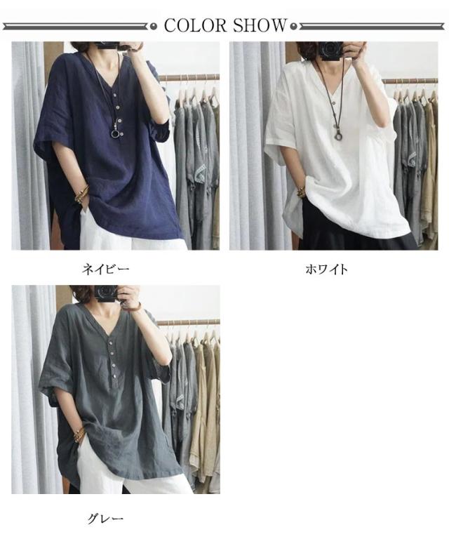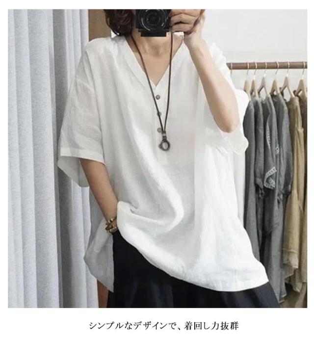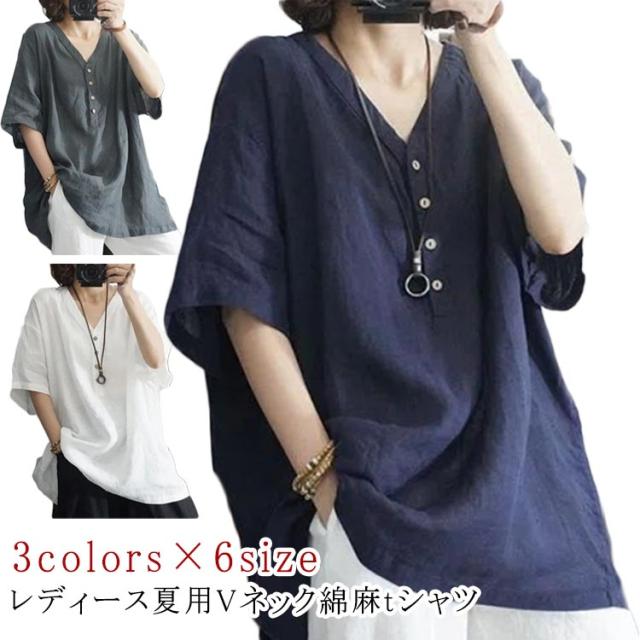 | 3colors×6size レディース夏用Vネック綿麻tシャツ 通気性や吸汗性に優れいている綿麻生地使用 シンプルなデザインで、着回し力抜群 | |