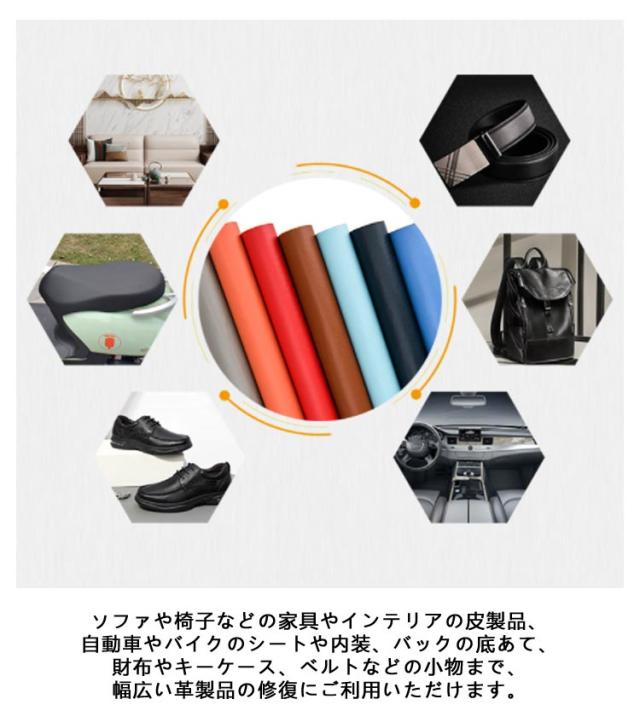 | 【合皮補修シート】【20×30cm(10枚)】【強力粘着】【全20色】 光沢感を抑えた少しマットな質感です。 柔らかく微弾性があり、防水性と耐摩耗性に優れています。 ソファや椅子などの家具やインテリアの皮製品、自動車やバイクのシートや内装、バックの底あて、財布やキーケース、ベルトなどの小物まで、幅広い革製品の修復にご利用いただけます。 好きな形に切って貼るだけだから手芸や洋裁、小物づくりなどハンドメイドにもおすすめです。 粘着でしっかり貼り付けできます。 PUレザーで高級感バッチリです。 手芸品や民芸品、工芸品などのDIYにもご利用いただけます。 | |