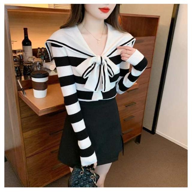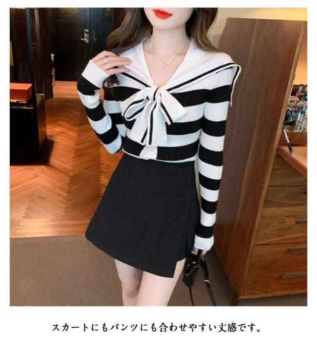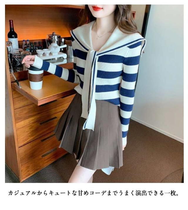 長袖 Vネック カットソー ショート ショート丈 ニット セーラー襟 春秋 かわいい 秋 春 プレゼント ニットトップス マリン風 冬 レディース ボーダー柄 可愛い 大きいサイズ 通勤 オフィス レイヤード 着回し デイリー ギフト 大人かわいい