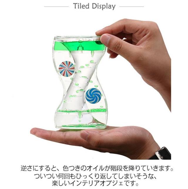 | ついつい見入ってしまう、不思議でキレイな砂時計のような、オイルタイマーです。 子どものおもちゃやオフィスの置物など、ストレスを解消して不安を軽減するのに適しています。 おしゃれな癒しインテリア。 逆さにすると、色つきのオイルが階段を降りていきます。 ついつい何回もひっくり返してしまいそうな、楽しいインテリアオブジェです。 この商品は癒しのインテリアグッズなので、時間を計測する物ではございません。 | |
