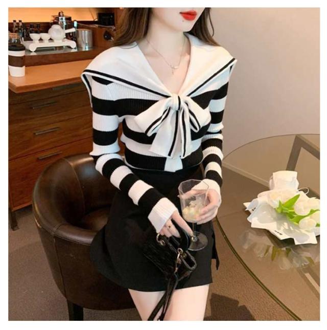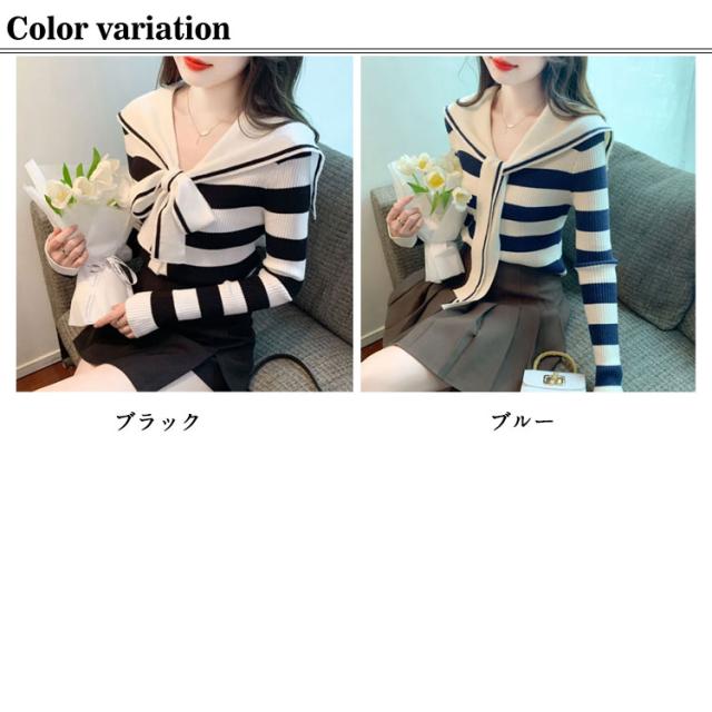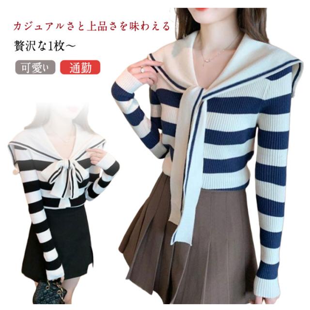 可愛い 長袖 春秋 ショート丈 カットソー Vネック セーラー襟 マリン風 ニットトップス ニット 春 秋 大人かわいい 長袖 ショート レディース ボーダー柄 かわいい 大きいサイズ 通勤 オフィス レイヤード 着回し デイリー ギフト プレゼント