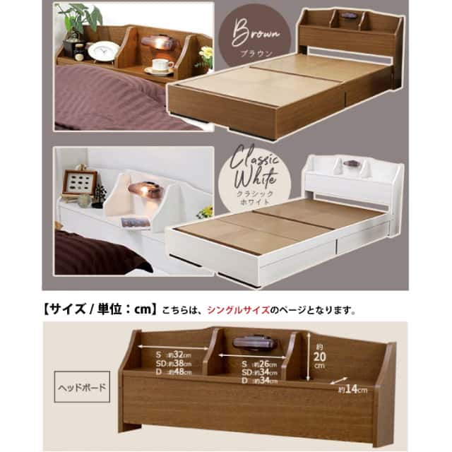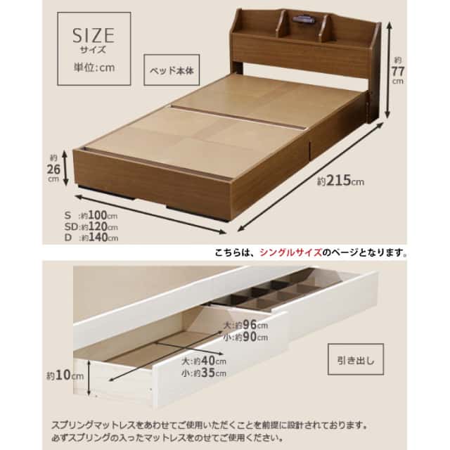 | サイズ | ・フレーム寸法: 幅(S:100 SD:120 D:140)×奥行215×高さ77cmMH約42cm ・引出し内寸: 大:W約96×D約40×H約10cm、 小:W約90×D約35×H約10cm(間仕切り付) ・マットレス寸法: 幅約(S:97 SD:120 D:140)×奥行195×高さ16cm |