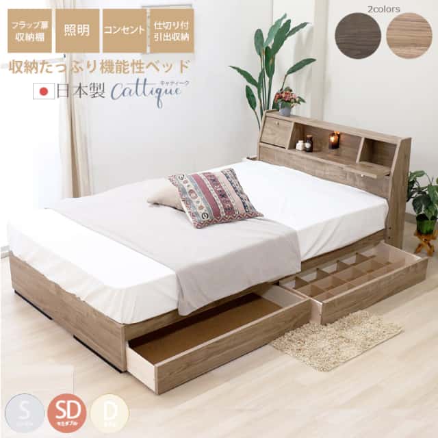 ベッド セミダブル マットレス付き 日本製フレーム フラップテーブル 照明 コンセント 引出し 収納 キャティーク 薄茶 濃茶 【代引不可】