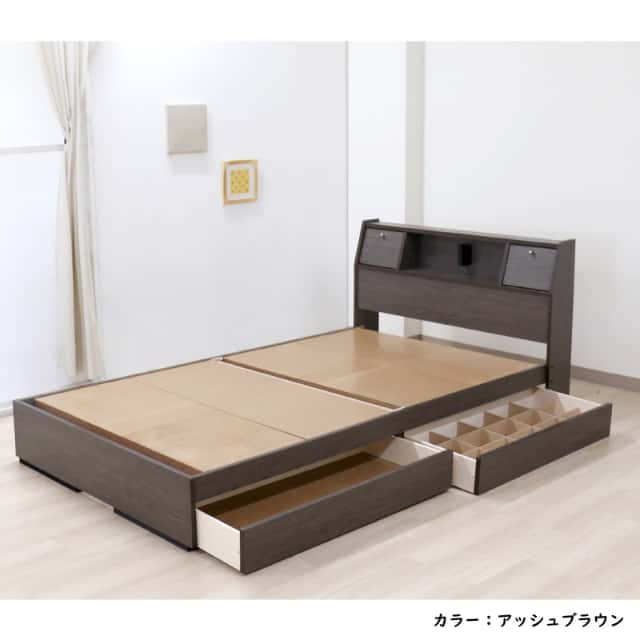 | サイズ | ・フレーム寸法: 幅(S:100 SD:120 D:140)×奥行215×高さ80cmMH約42cm ・引出し内寸: 大:W約96×D約40×H約10cm、 小:W約90×D約35×H約10cm(間仕切り付) ・マットレス寸法: 幅約(S:97 SD:120 D:140)×奥行195×高さ16cm |