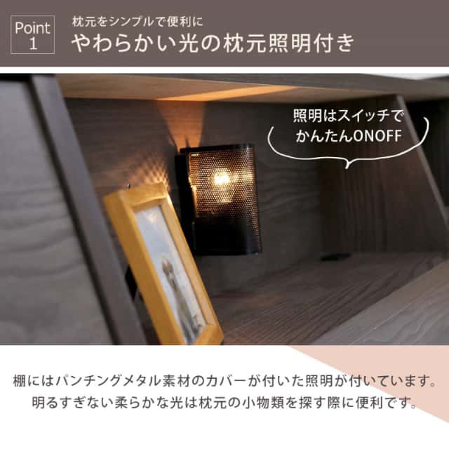 | 特徴 | 【人気モデルにおしゃれなヴィンテージ風カラーが登場!充実した機能はそのままにヴィンテージカラーでお部屋を彩ります。】 ・フラップテーブル、照明、コンセント、収納棚が付属したヘッドキャビネット。 ・2杯の引出し収納も付属。 ・色々な物が置けるフラップテーブルは使い勝手抜群。 ・引き出しには間仕切りが付属しており、小物を片付けるのに便利です。 ・フレームは安心の日本製。 ・お部屋に合わせて選べる2色。 ・圧縮ロール片面ポケットコイルマットレス付き。 ※組み立ての際には+ドライバーと先端の柔らかいハンマー、 床面を保護する物をご用意下さい。 |