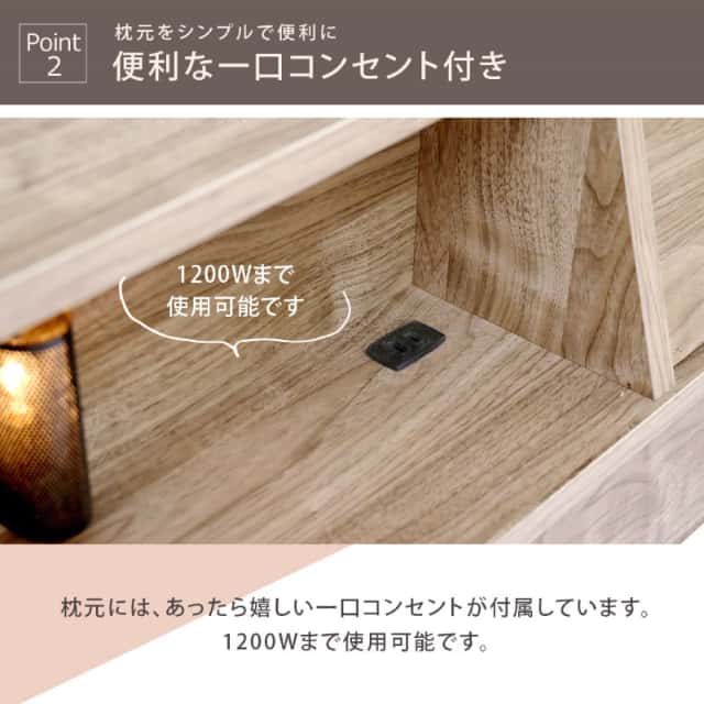 | 仕様 | ・本体主材/プリント化粧板、白熱灯(10W)1灯、1口コンセント(1200W) ・マットレス主材:2.0mm6巻ポケットコイルスプリング(コイル数/S:465 SD:620 D:682)、ウレタン、フェルト、ポリエステル |