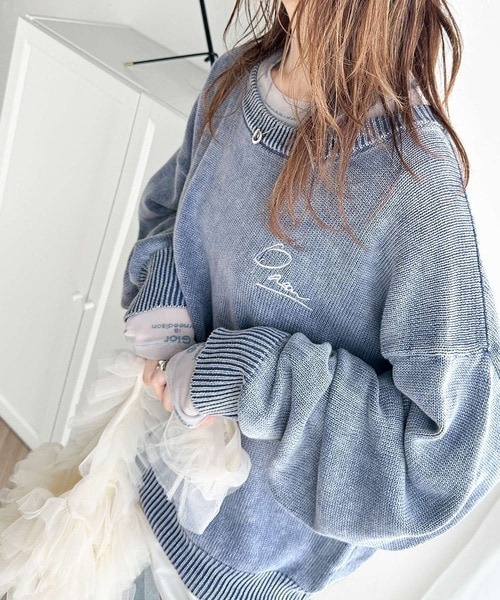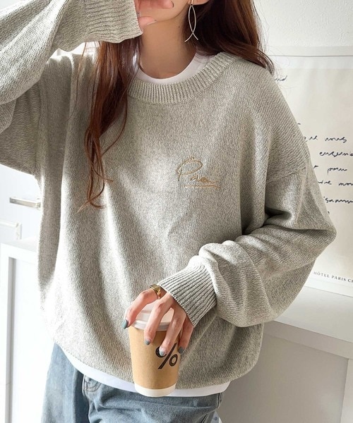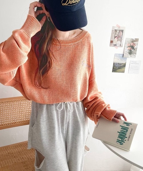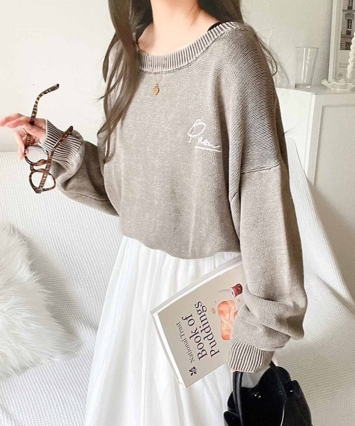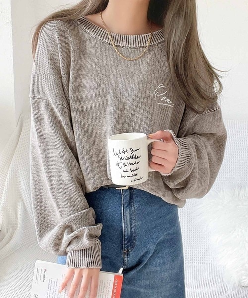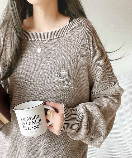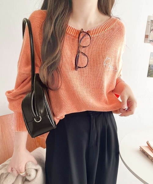 大人可愛いレトロな雰囲気。綿100%ワンポイント刺繍ピグメントニットプルオーバー