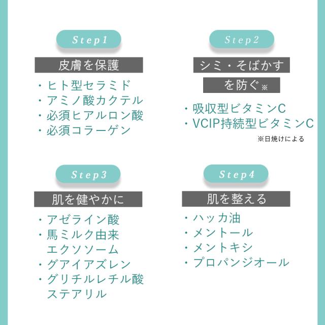 | 全成分 | 水、グリセリン、BG、ペンチレングリコール、ジグリセリン、スクワラン、(PEG-240/デシルテトタデセス-20/HDI)コポリマー、アゼライン酸、馬乳、ナイアシンアミド、グアイアズレン、ステアリン酸グリチルレチニル、ヒアルロン酸Na、水溶性コラーゲン、加水分解コラーゲン、サクシノイルアテロコラーゲン、リン酸アスコルビルMg、テトラヘキシルデカン酸アスコルビル、グリチルリチン酸2K、ベタイン、セラミドNG、水添レシチン、フィトステロールズ、タウリン、リシンHCI、アラニン、ヒスチジンHCI、アルギニン、セリン、プロリン、グルタミン酸、トレオニン、バリン、ロイシン、グリシン、アラントイン、ニンニクエキス、イソロイシン、フェニルアラニン、プラセンタエキス、プロパンジオール、アミノカプロン酸、PCA-Na、ステアリン酸ソルビタン、トコフェロール、エチルへキシルグリセリン、トリ(カプリル酸/カプリン酸)グリセリル、カルボマー、ステアリン酸グリセリル(SE)、ミリスチルアルコール、水酸化ナトリウム、ポリクオタニウム-51、フェノキシエタノール、メントキシプロパンジオール、ハッカ油、メントール |