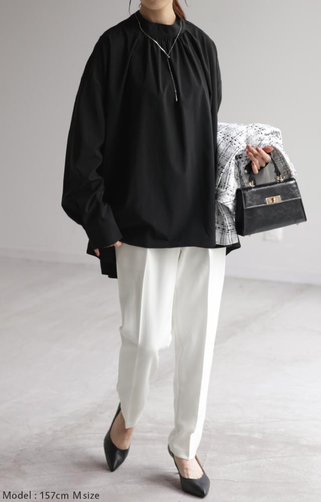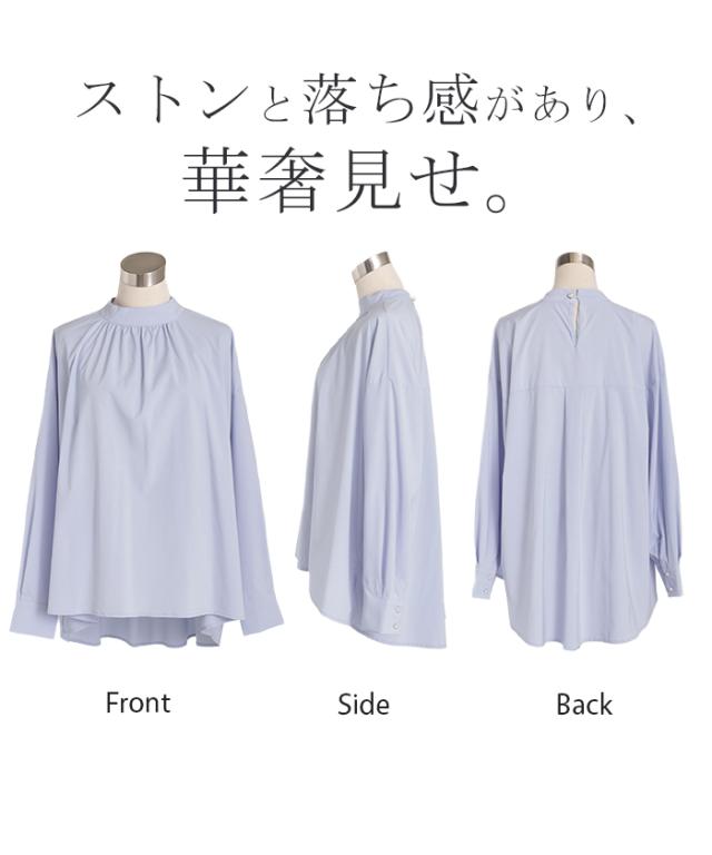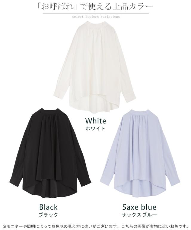 ブラウス フォーマル シャツ パール レディース トップス ギャザー 無地 長袖 きれいめ Aライン チュニック ロング ロングシャツ オフィスカジュアル セミフォーマル 体型カバー 大きいサイズ お尻が隠れる 入学式 卒業式 黒 白 ブルー 春 夏 HUG.U 秋新作