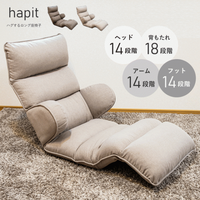 | 【抱きしめられているようなホールド感】 頭・背・肘・脚部に14段階の角度調節ギア搭載で首への負荷を徹底サポート! 首へのストレスが軽減され、長時間座っても快適な時間を過ごせます。 ローテーブルでの勉強や仕事のほか、読書やゲームなどのリラックスタイムにもおすすめです♪ 【座面は低反発素材で座り心地重視】 からだを包み込むような心地良さの低反発ウレタンを使用。 ボリュームたっぷりのクッションは立体的にからだにフィット。 座面が沈み込まないクッション性抜群で首までしっかりサポート&おしりも安定して快適です。 【高機能でインテリアにもなじむシンプルなデザイン】 アームレストがしっかりと肘を支えてくれるからうつむき姿勢にならない! 首を伸ばした正しい姿勢をサポートしてくれるので、テレビや読書姿勢がとっても楽になります。 また飽きのこないカラーとシンプルデザインはゆとりの空間が生まれお部屋を広く感じさせてくれます。 【ハイバック&全身座れるロングタイプ】 座面から背もたれトップまでの長さは67cmで頭をしっかりとあずける事が出来るうれしいハイバック。 ヘッドレスト(頭部)、バックレスト(背もたれ)、フットレスト、アームレストはそれぞれ14段リクライニングが可能。 何通りもの角度に調節することができるからあなたにぴったりの位置がきっと見つかります。 【製品仕様】 サイズ:幅59-100×奥行60-160×高さ17-77cm 座面高14cm / 重量12.1kg 生地:ポリエステル100% クッション材:ウレタンフォーム 構造材:スチール(鋼) 機能:バックレストフリーロック18段ギア 、ヘッドレスト14段ギア、フットレスト14段x2か所、アームレスト14段 支えてくれるポイントが多いから ゆったり快適なハピットのロングタイプ 【他には無い! ハピットの動くアームレスト機能】 14段階で細かく角度を調節出来るアームレストはあなたにぴったりの肘置きに。 アームレストは座面に取り付けられているのが一般的ですが、ハピットは背に付いています。 その為、肘をピンポイントで支える事が出来、スマホ姿勢の腕がとっても楽に。 現代人のライフスタイルにぴったりの新しい機能です。 疲れの溜まりやすい「首」「腕」「足」を14段ギアでゆったりと支えてくれるから、長時間座っても快適つづく。 アームレストがしっかりと肘を支えてくれるからうつむき姿勢にならない! 首を伸ばした正しい姿勢をサポートしてくれます。 さらにヘッドレストは14段階で細かく位置を調整出来るからあなたにぴったりの位置がきっと見つかる。 首への負荷を軽減してくれます。 大好きな読書も長時間だと腕がだるくなっちゃいます。 ハピットならアームレストが腕を支えてくれるから、読書もスマホもゲームも快適です。 また短めの肘は椅子の出入りの邪魔にならず、ストレス無くご使用頂けます。 足を伸ばして座れるから脱力してリラックス出来る。 また座面には2か所のリクライニングポイントがあり、角度を調節することで疲れやすい足をゆったりと持ち上げて休ませてくれます。 座面から背もたれトップまでの長さは67cm。 頭をしっかりと背もたれにあずける事が出来るうれしいハイバック。 頭が楽だと長時間座っても疲れません。 体圧分散効果のある低反発ウレタンを座面のクッション材に採用。 じわっとゆっくり沈み込む感覚の低反発ウレタンは、長時間座った時のお尻への負担を軽減してくれます。 少しでも長く使ってほしいから。 ハピットは厳選したウレタンをたっぷりとクッション材に使用しています。 だからふっかふかのクッションが体を包み込むように支えてくれるのです。 背もたれはフラットにしなくても角度調節可能な新ギアを搭載。 止めたい角度まで倒したら少し戻すだけで簡単ロック。 壁際の狭いスペースでも調節が可能です。 ゆったり寛げる座椅子は欲しいけど、場所をとるのがちょっと。。という方は多いと思います。 ハピットは大きいのに背を畳めるのでこんなにコンパクトに! 使わない時も邪魔にならないからいいですね。 フルフラットに伸ばせばまるでベッドのように。 ヘッドを少し起こして枕にすれば快適に眠る事も出来ます。 |
