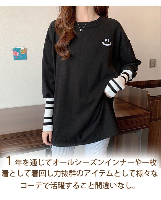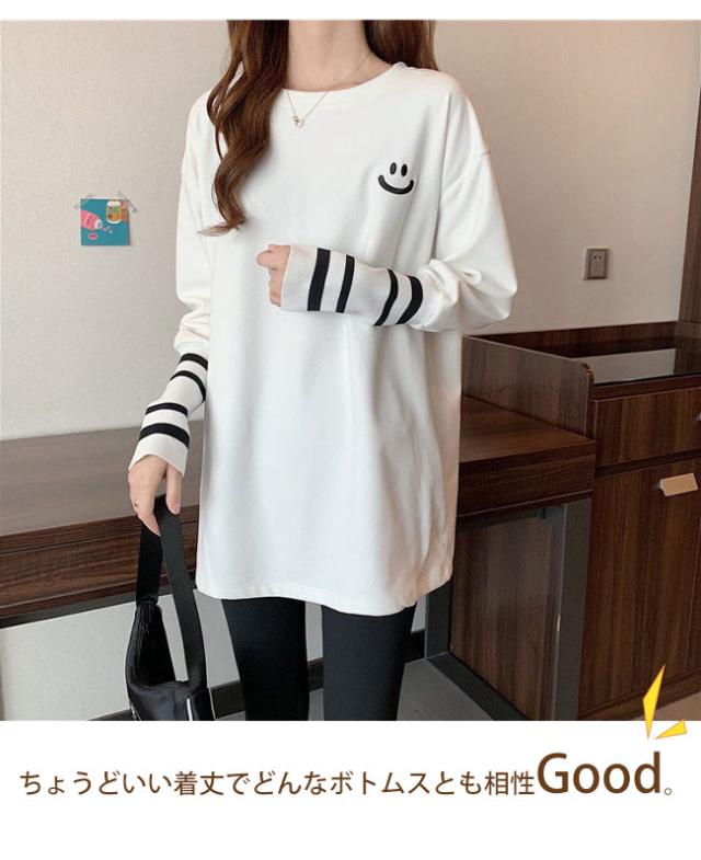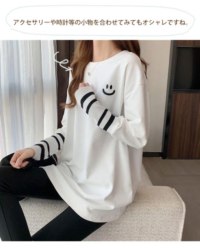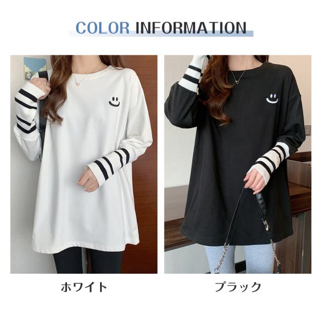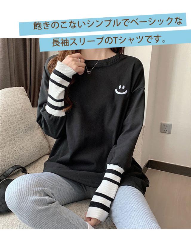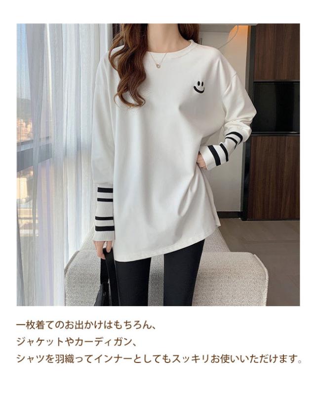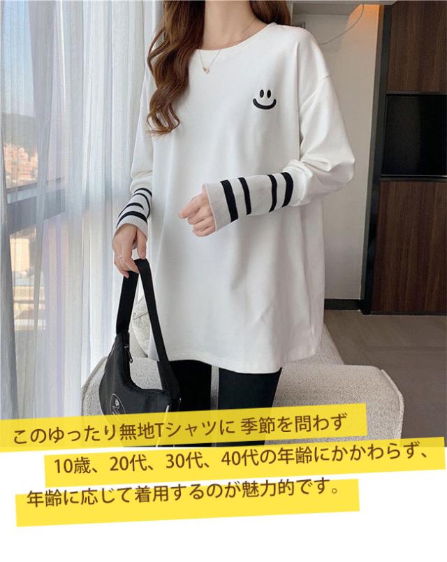 秋新作 長袖Tシャツ レディース ロングtシャツ 長袖 春服 秋服 ゆったり ビッグシルエット ロンT トップス カットソー 笑顔 刺繍 ロングTシャツ 可愛い 韓国ファッション カジュアル 体型カバー