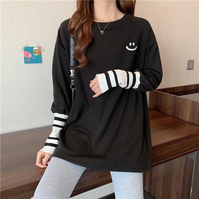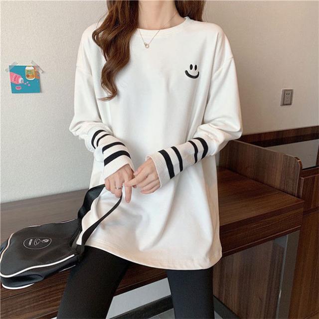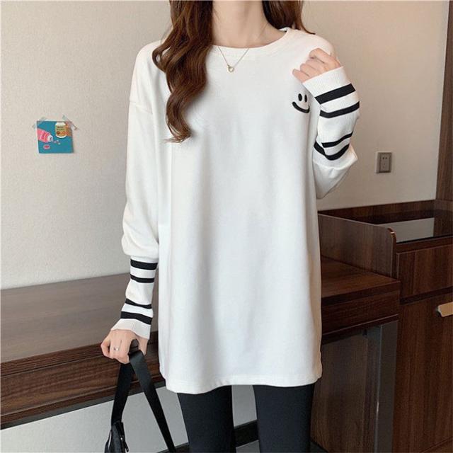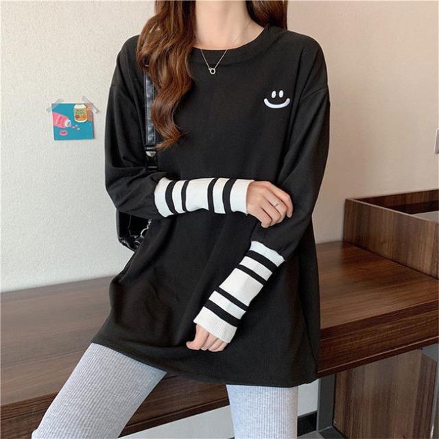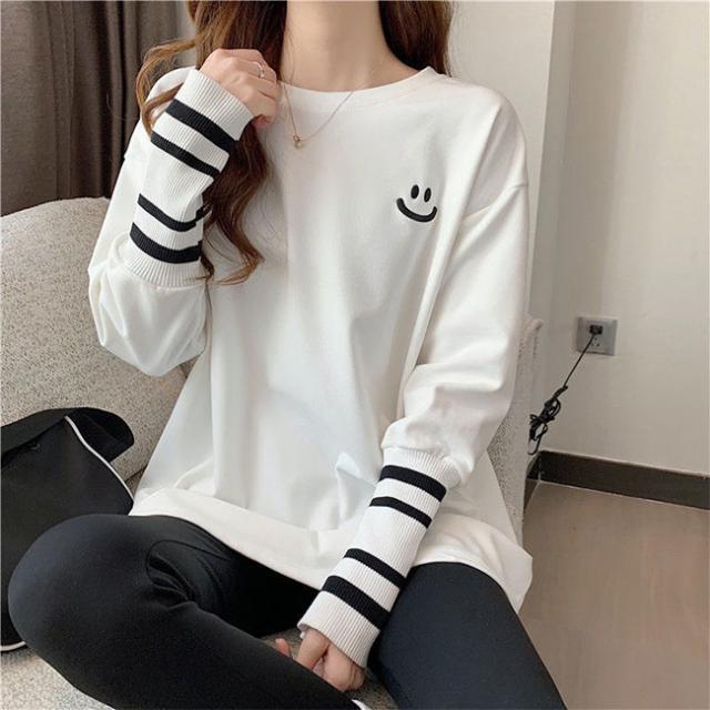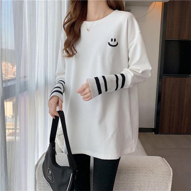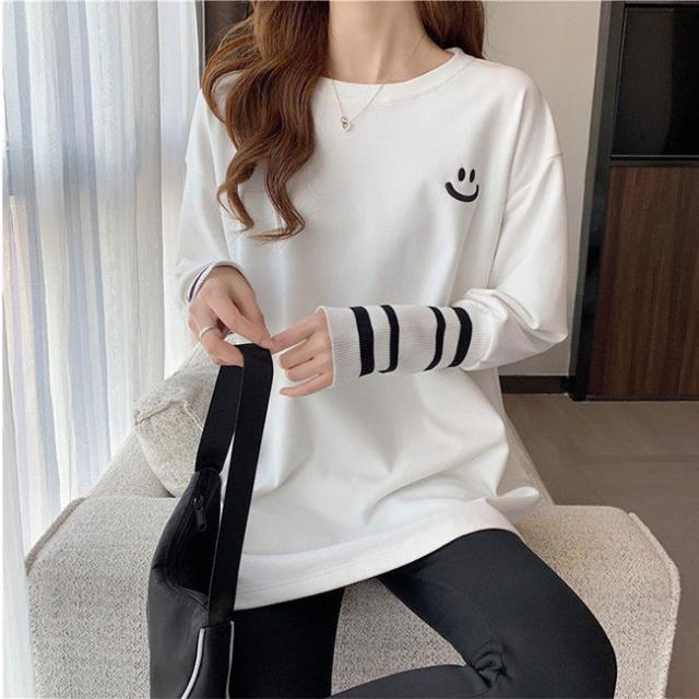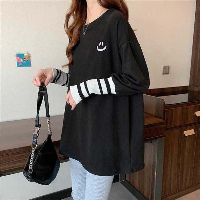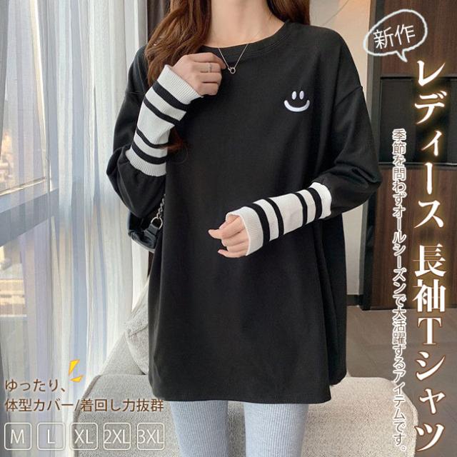 秋新作 長袖Tシャツ レディース ロングtシャツ 長袖 春服 秋服 ゆったり ビッグシルエット ロンT トップス カットソー 笑顔 刺繍 ロングTシャツ 可愛い 韓国ファッション カジュアル 体型カバー