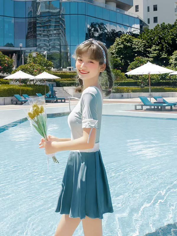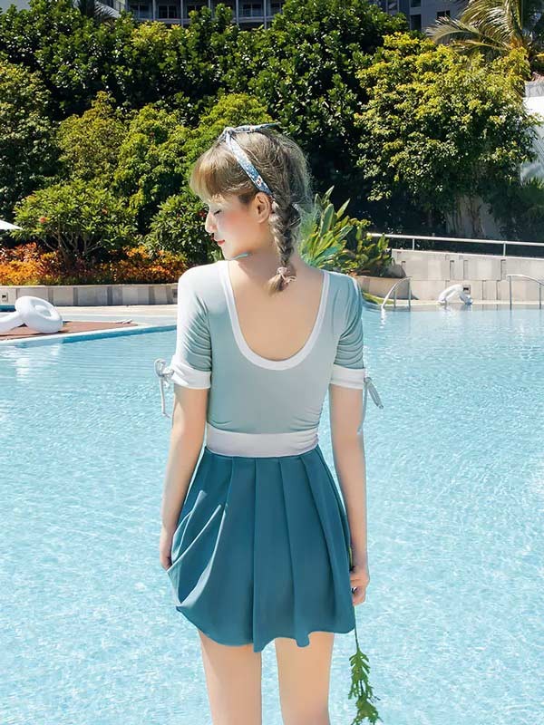 ワンピース水着 服みたいな 水着 2点セット リボン 半袖 無地 切り替え ワイヤーなし パッド付 レディース 着?せ カジュアル シンプル セクシー 露出控えめ 写真映え 撮影用 海 夏 サマー プール リゾート かわいい 旅行 温泉 大人 女性用 ジュニア 学生 女の子 グリーン ホワイト df472m4h5