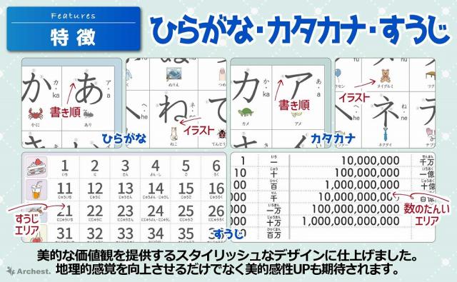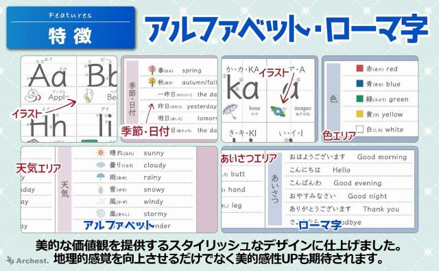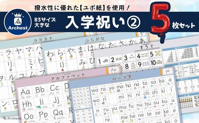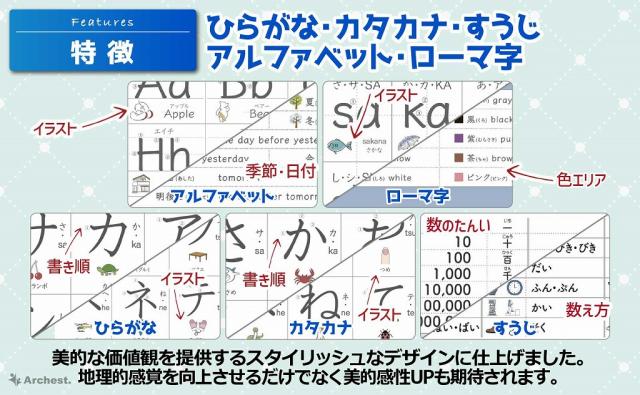 内 容:ひらがな1枚、カタカナ1枚、すうじ1枚、アルファベット1枚、ローマ字1枚サイズ:B3サイズ(364×515mm)