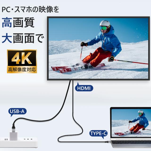 4K解像度(3840×2160)にも対応しており、スマホなどのデバイスから映画、テレビ番組、音楽、写真などをHDMI端子(入力)搭載のテレビやモニタに映して、精細な画像をお楽しみ頂けます。