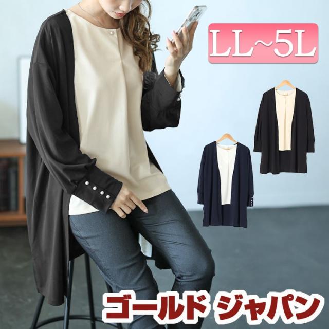 秋新作 大きいサイズ レディース トップス アンサンブル パールボタンロングトッパーカーディガン&ブラウス2点セット セット ブラウス カーディガン ロング トッパー パール 長袖 ストレッチ 通勤 秋服 夏服 春服 LL 2L 3L 4L 5L ブラック 黒 ネイビー ゴールドジャパン