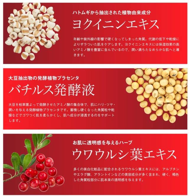 ハマメリス水、水、BG、エタノール、バチルス発酵物、ヨクイニンエキス、ウワウルシ葉エキス、リン酸アスコルビルMg、アルゲエキス、ヒアルロン酸Na、PG、グリセリン、メチルパラベン、フェノキシエタノール