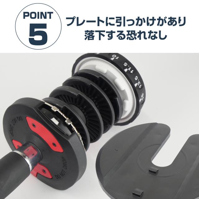 外したプレートをまとめて置ける専用ドックを付属。ダンベルも上から置けるので、コンパクトかつ転がず安全に収納できます。